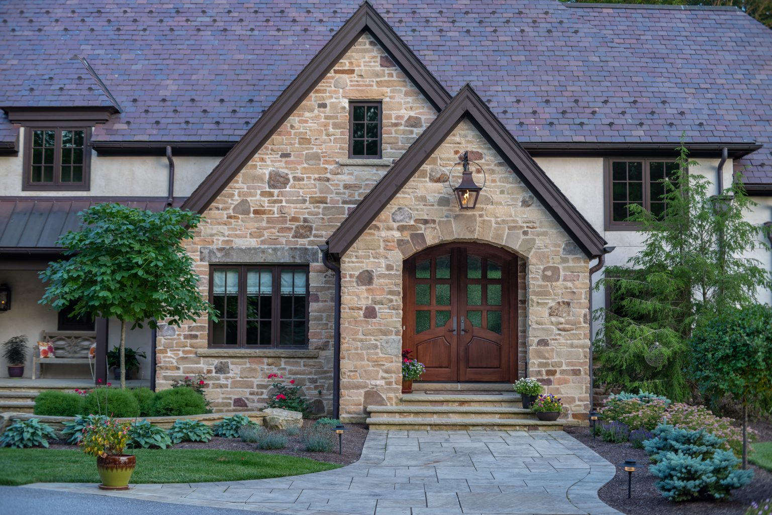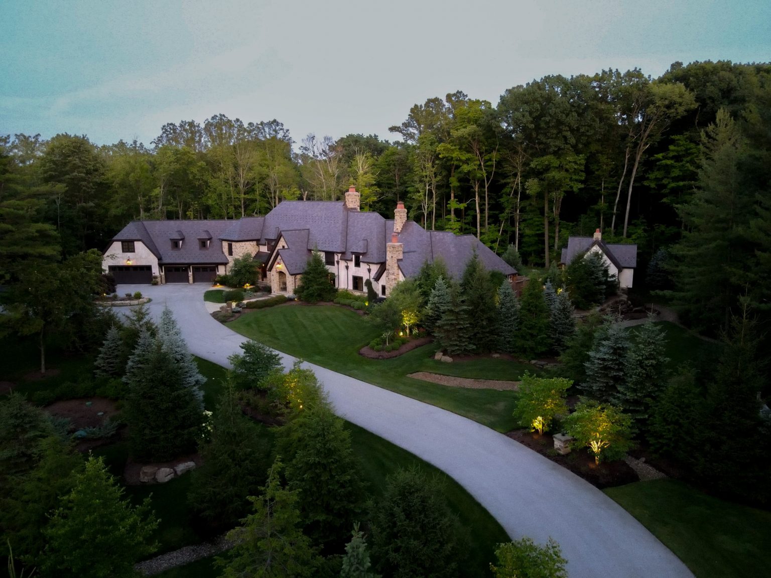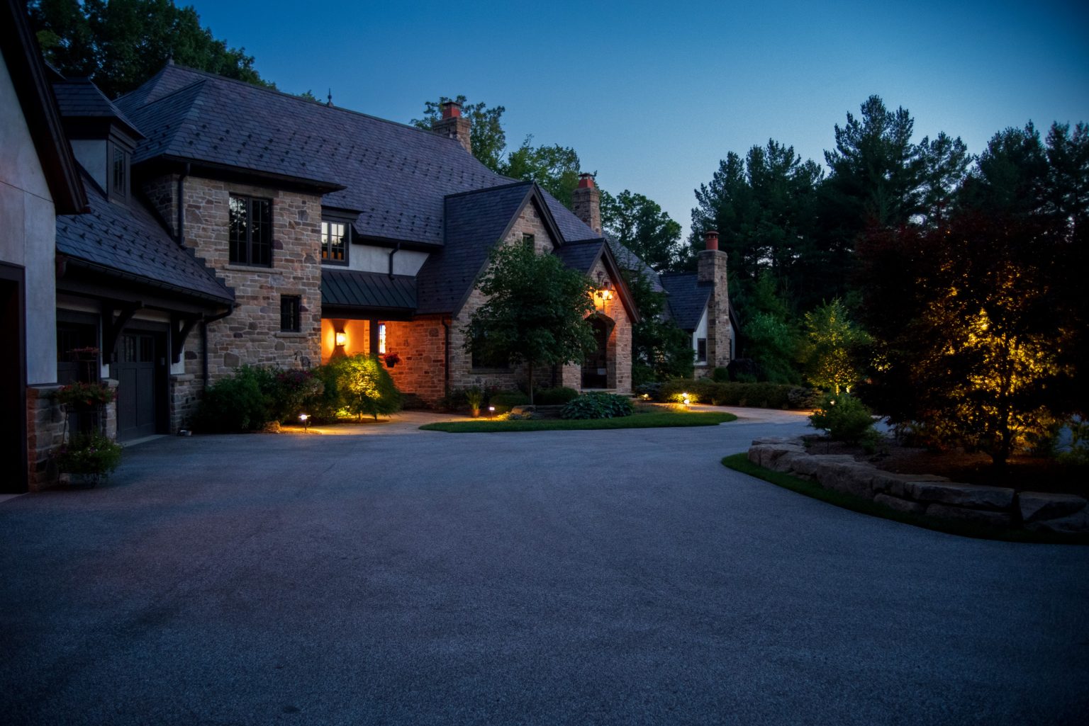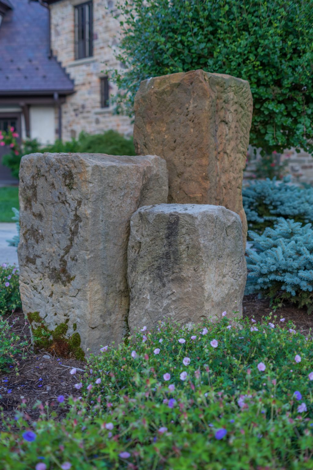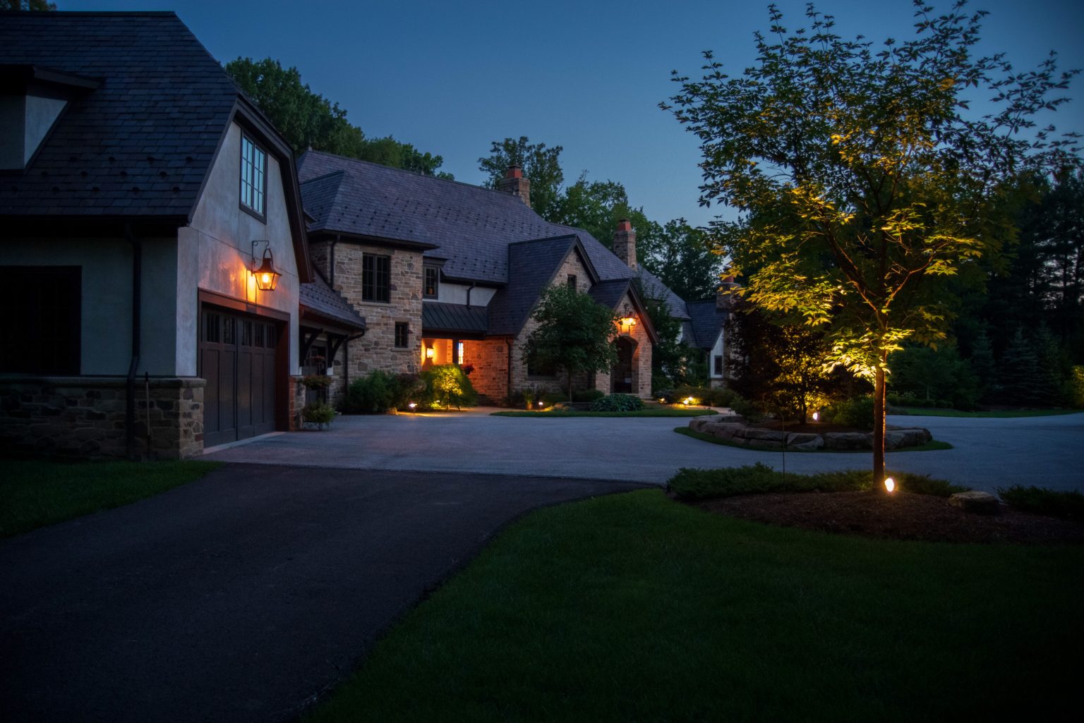 County Line Estate’s long, winding driveway leads to a large turnaround and fabricated sandstone drop-off spaces at the front of the home. Layered planting beds featuring salvaged stone elements were designed to emphasize the home’s impressive architecture, an effect further enhanced by extensive LED and gas lighting.