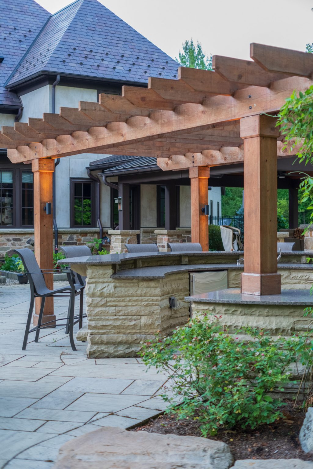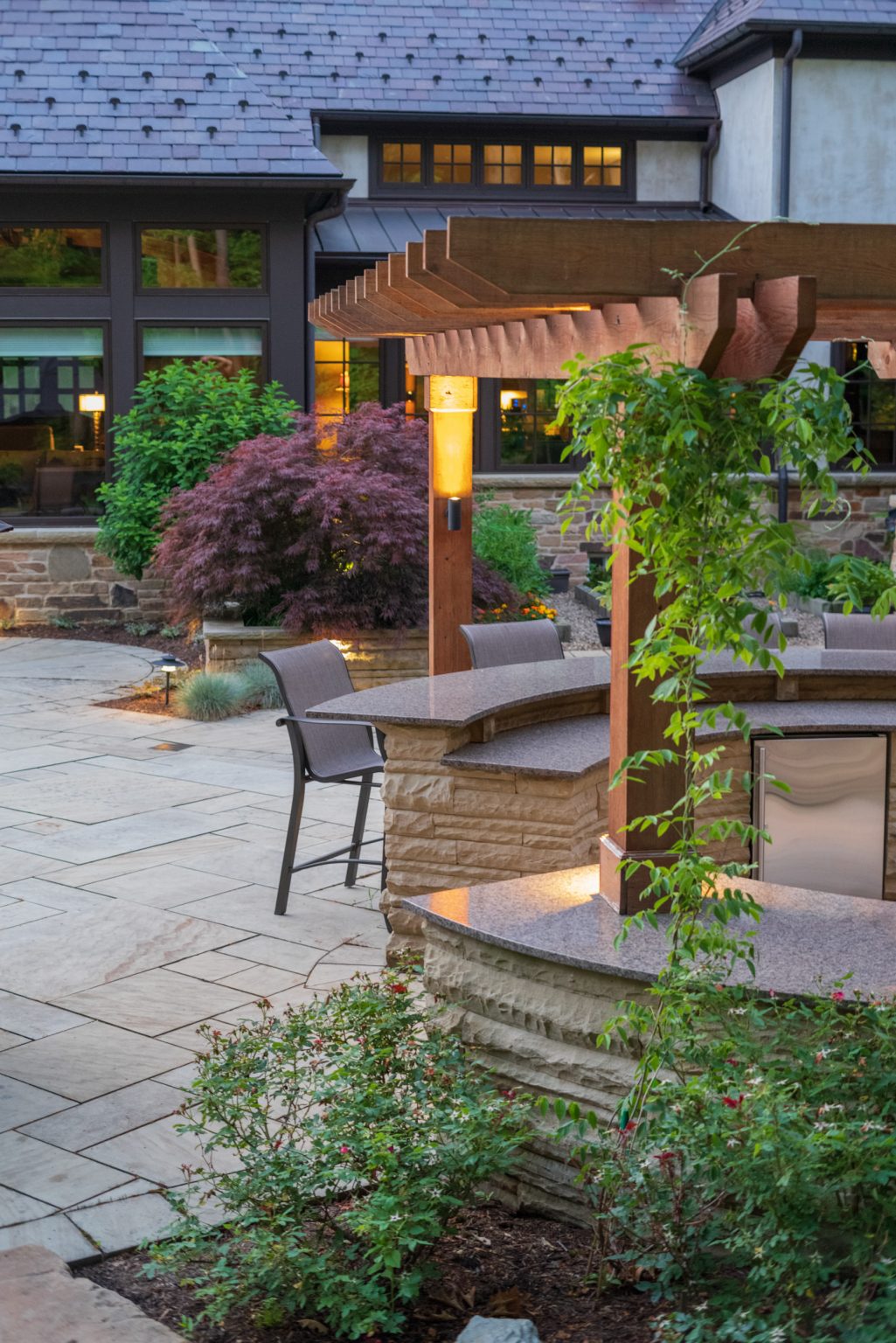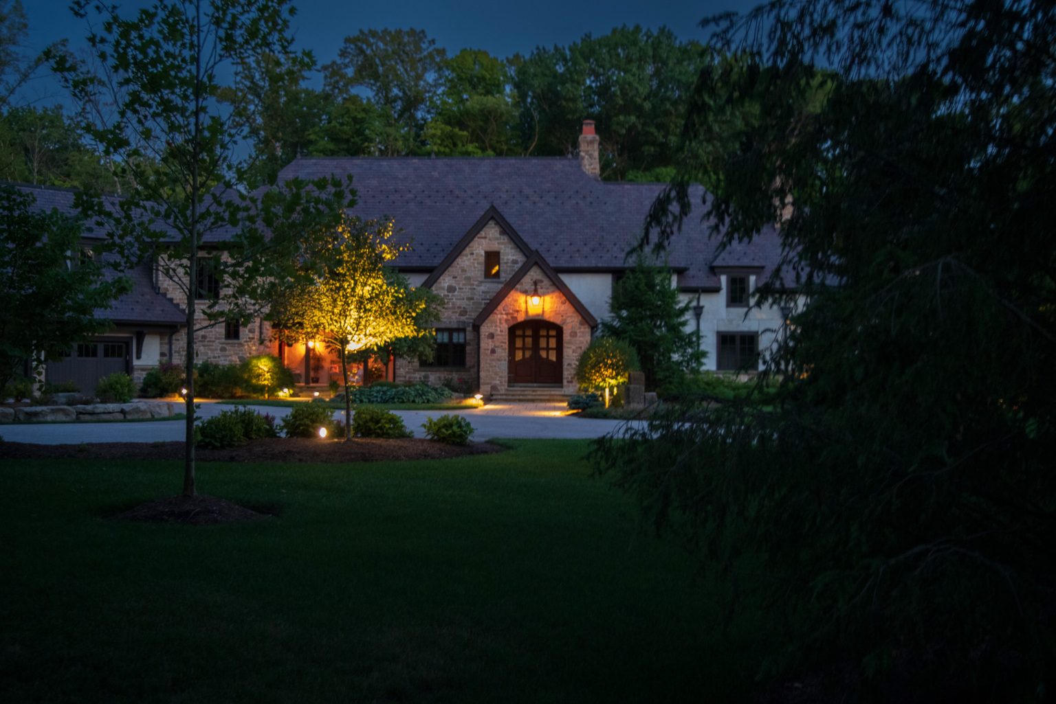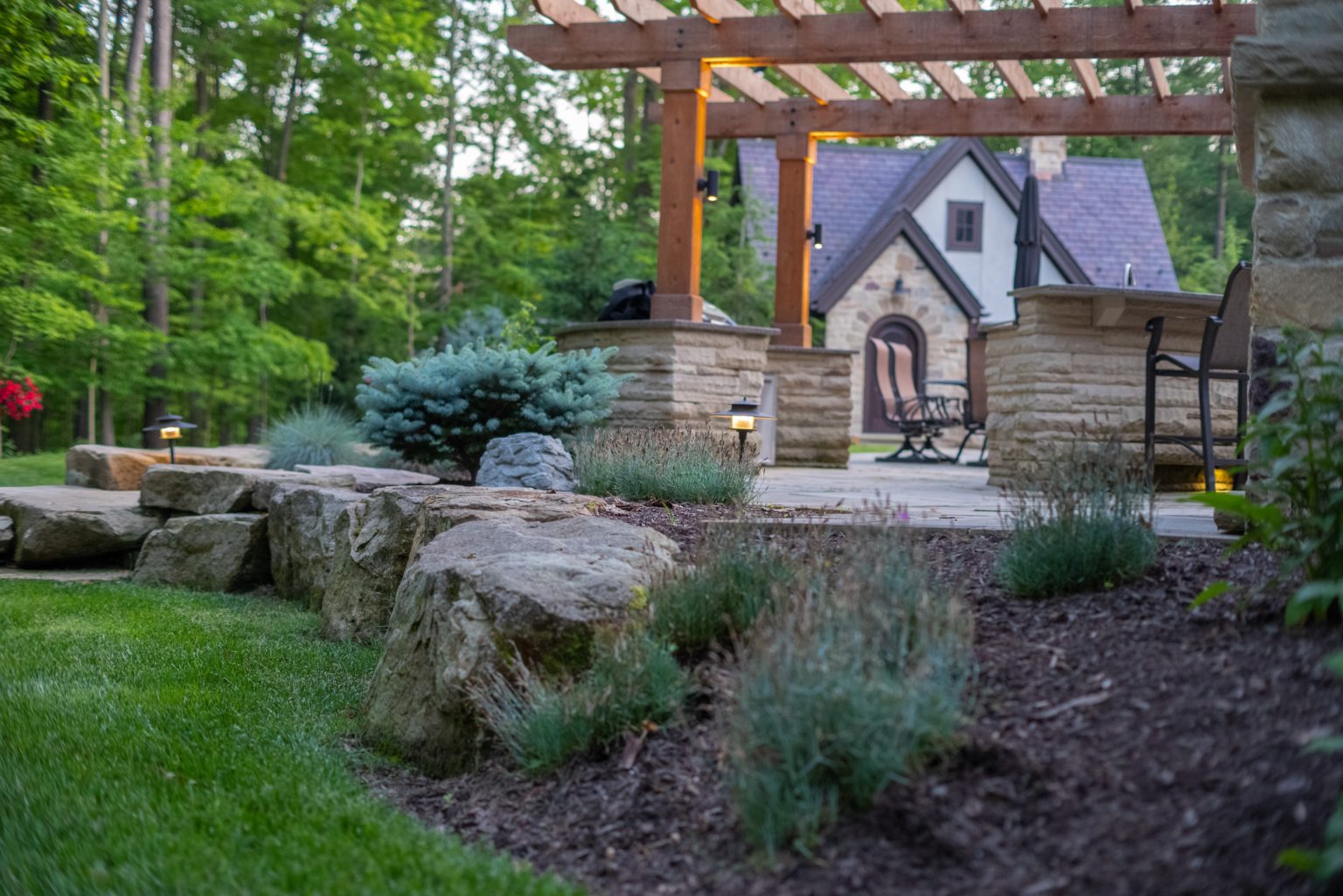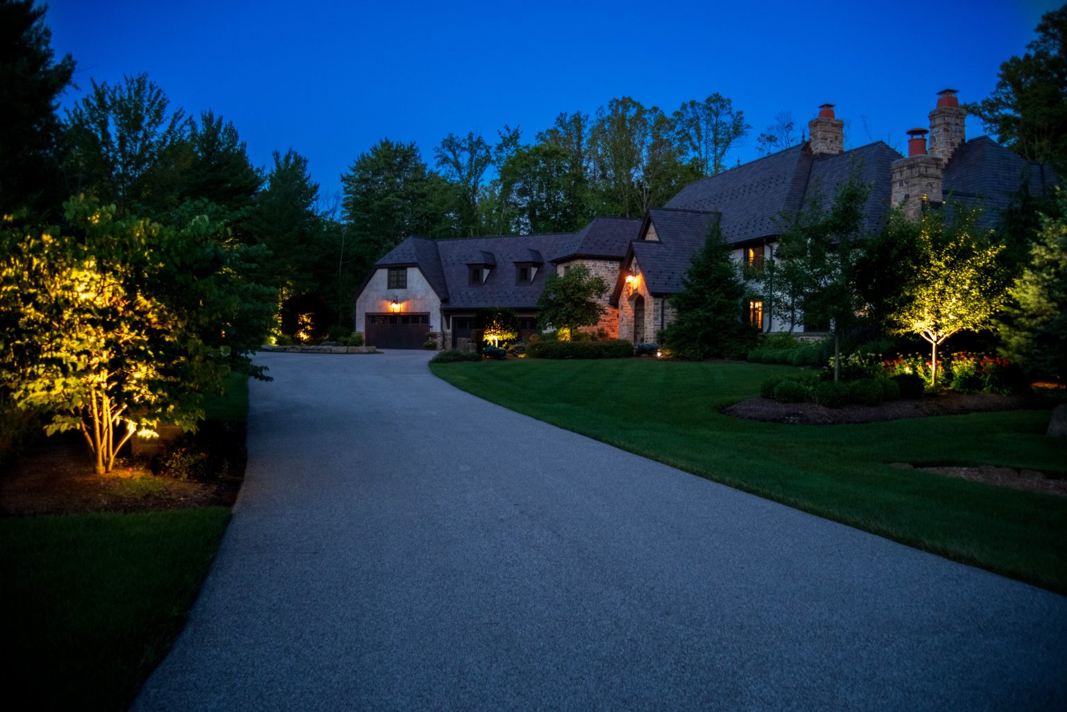 County Line Estate’s long, winding driveway leads to a large turnaround and fabricated sandstone drop-off spaces at the front of the home. Layered planting beds featuring salvaged stone elements were designed to emphasize the home’s impressive architecture, an effect further enhanced by extensive LED and gas lighting.