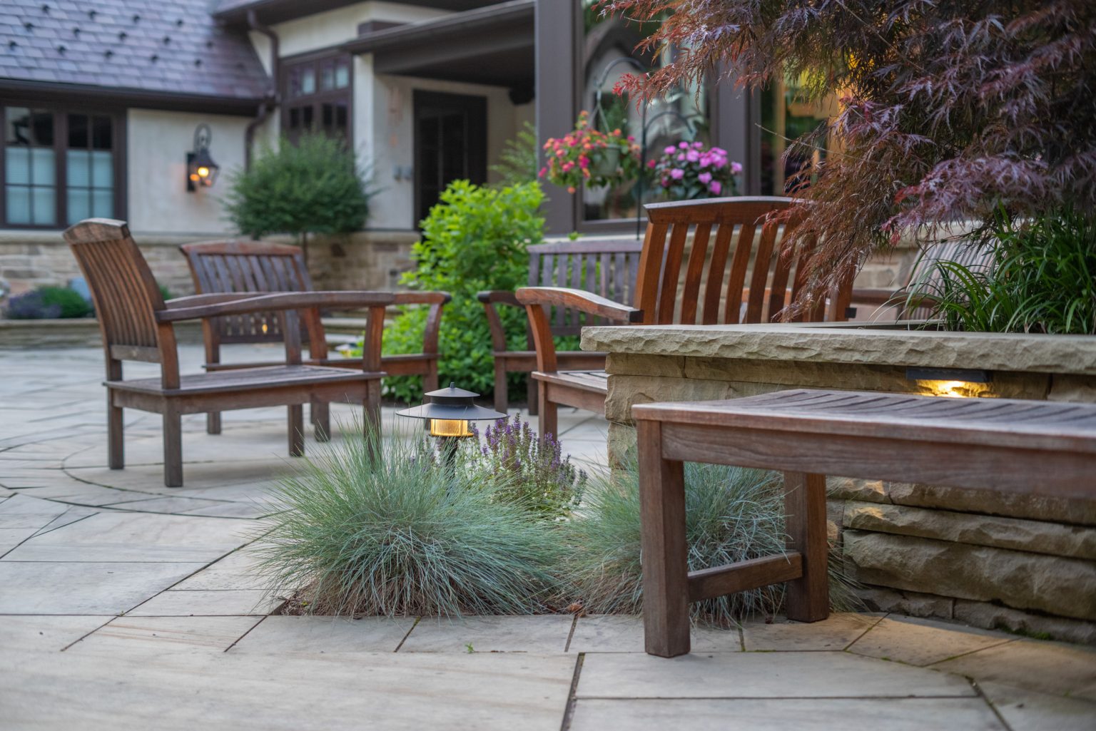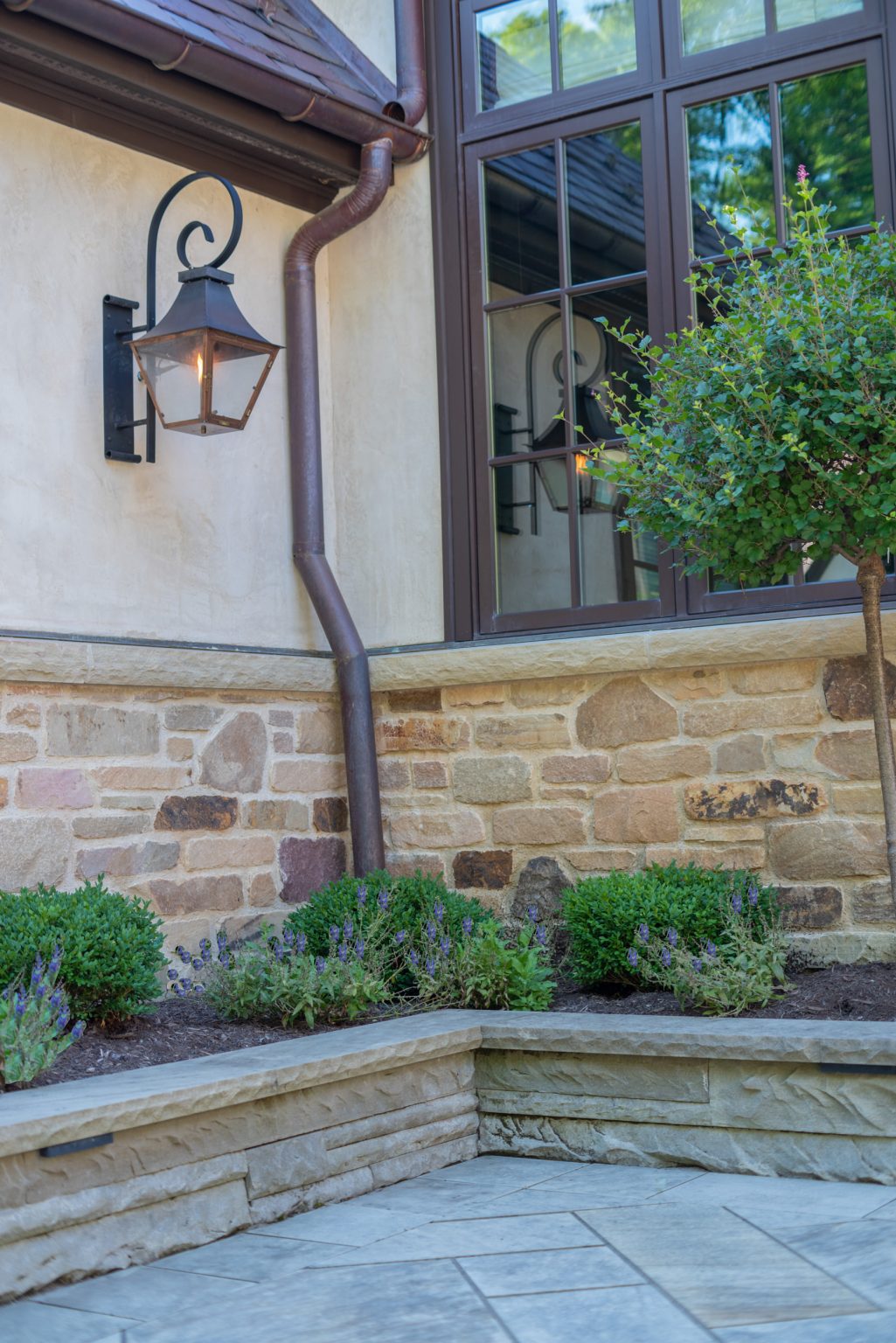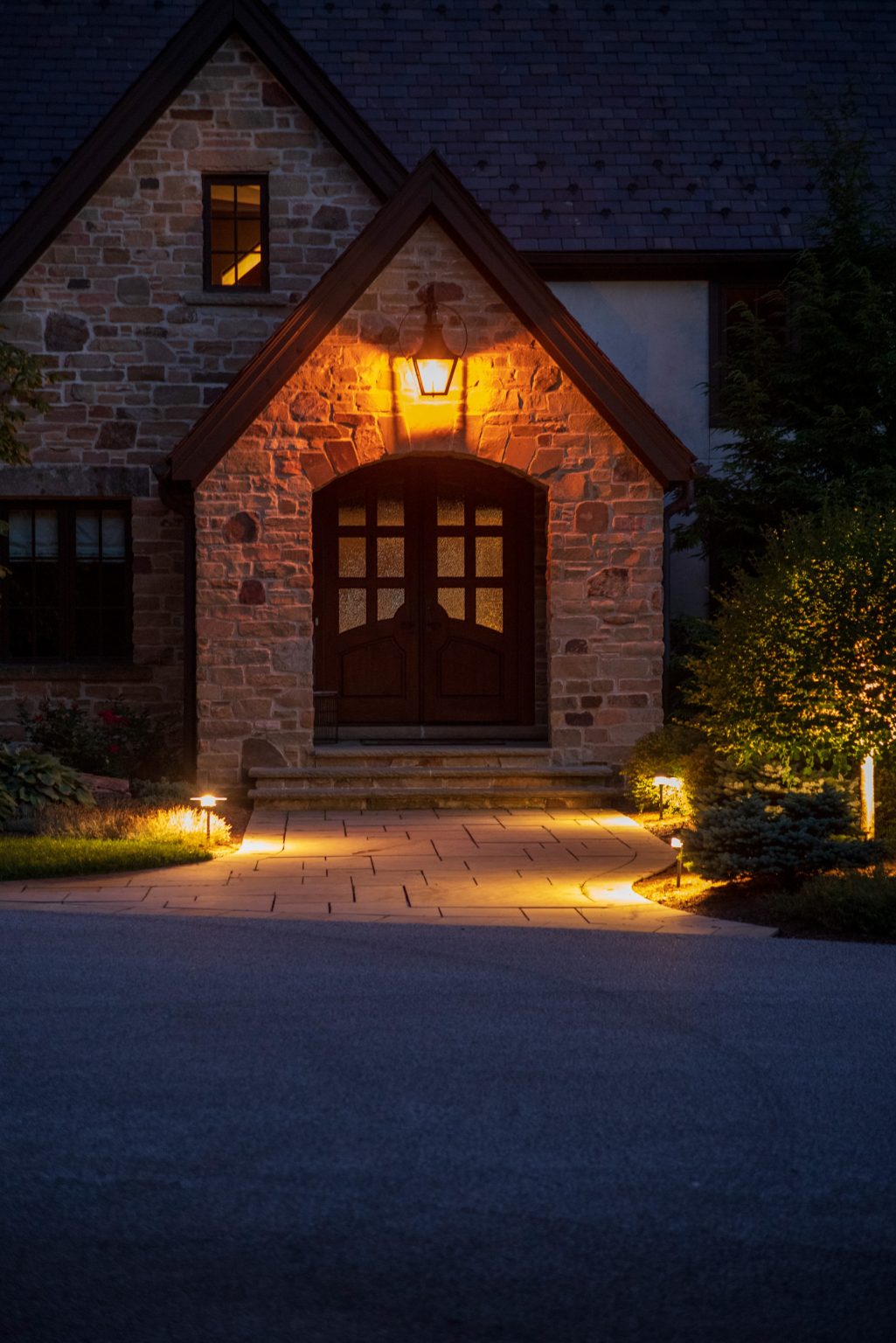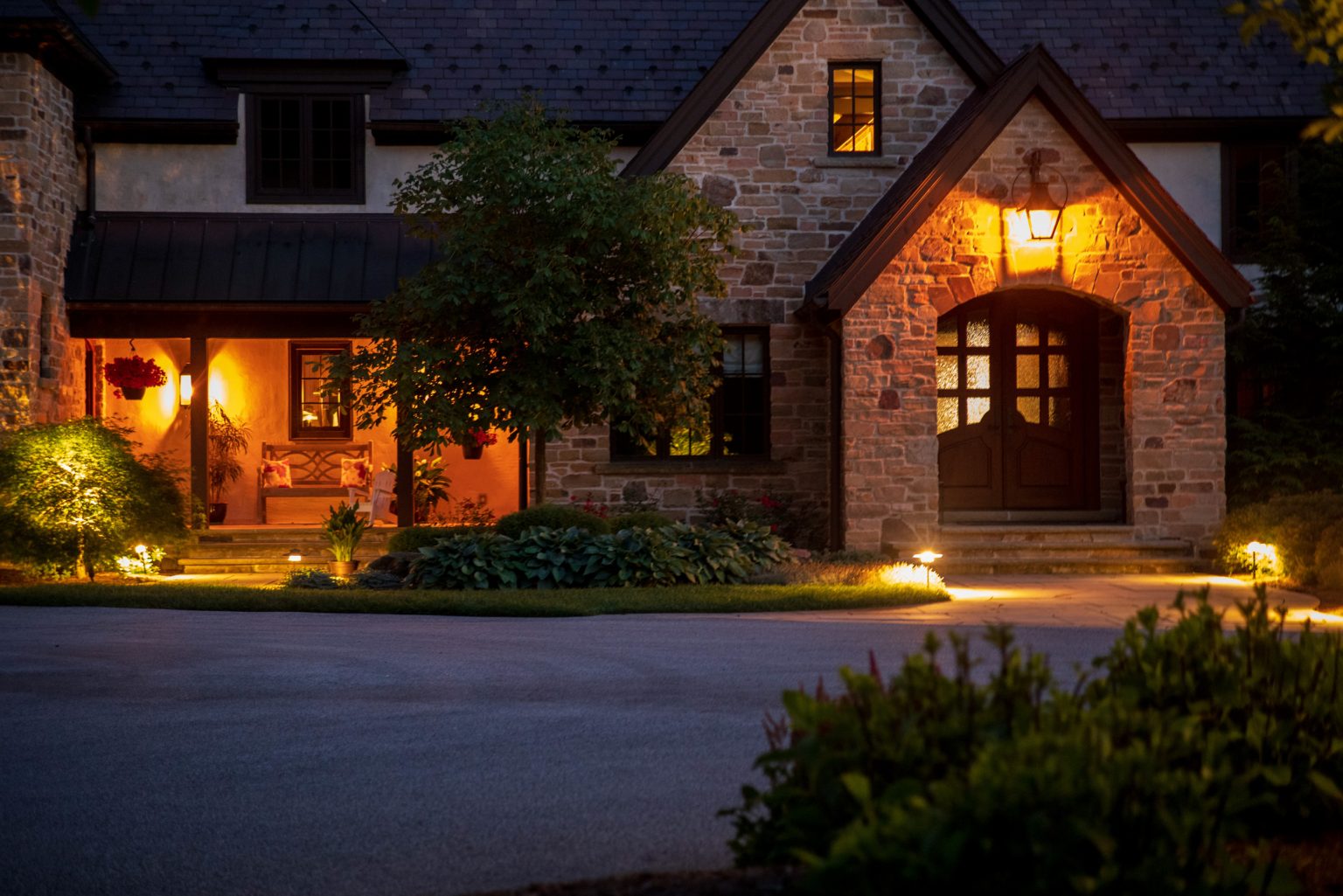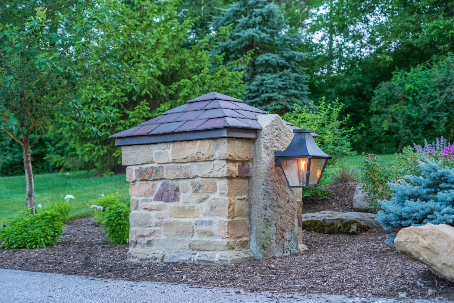 County Line Estate’s long, winding driveway leads to a large turnaround and fabricated sandstone drop-off spaces at the front of the home. Layered planting beds featuring salvaged stone elements were designed to emphasize the home’s impressive architecture, an effect further enhanced by extensive LED and gas lighting.
