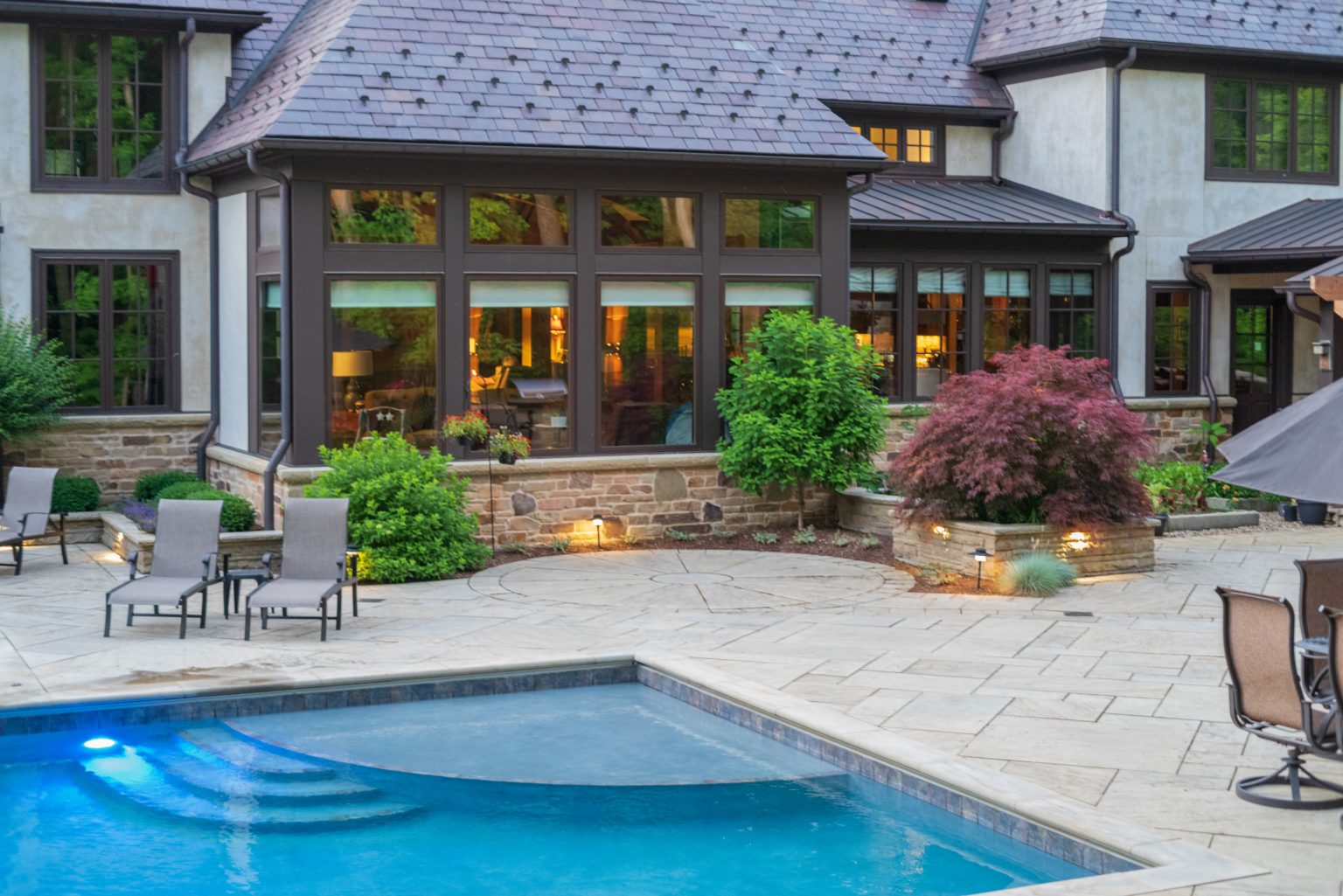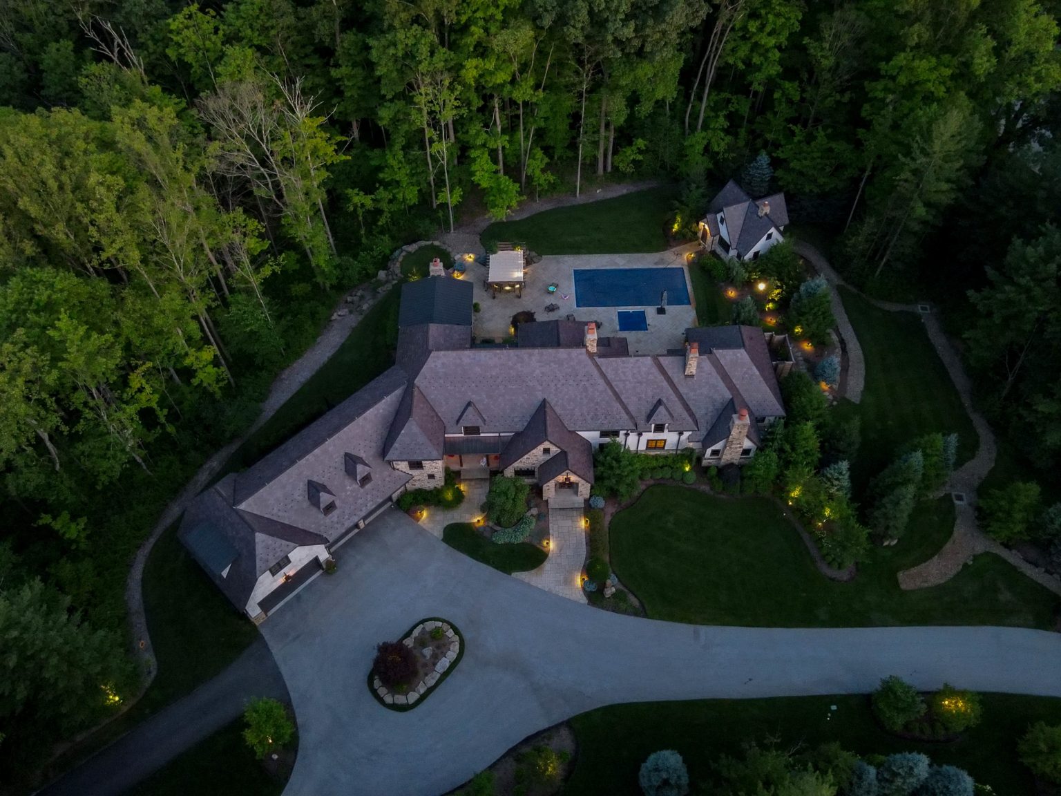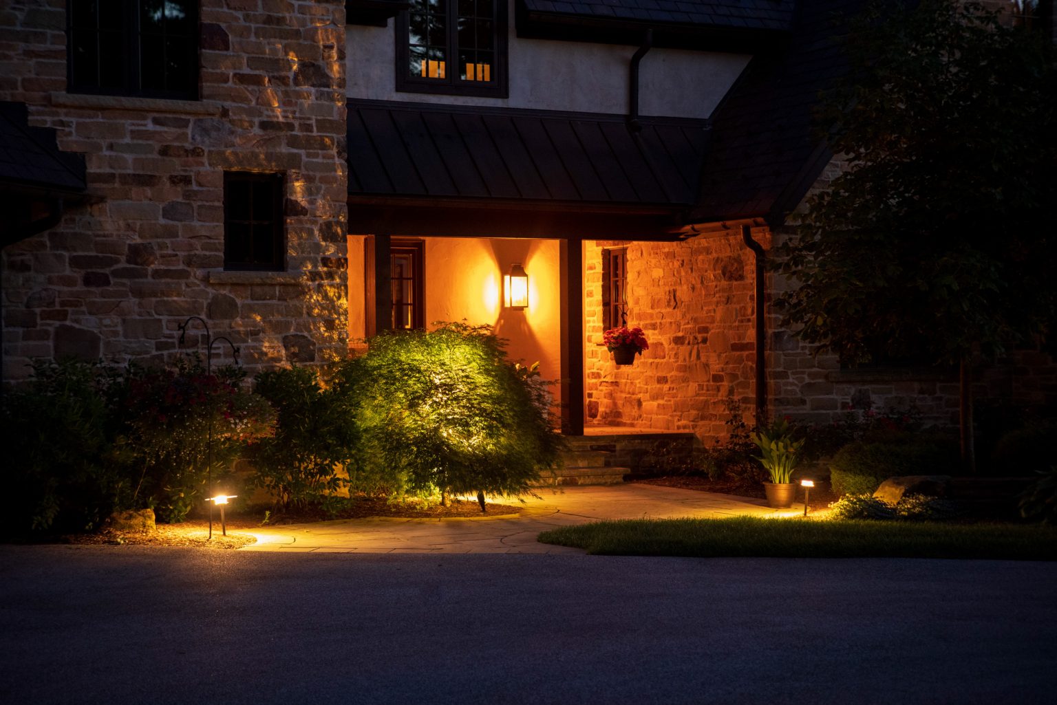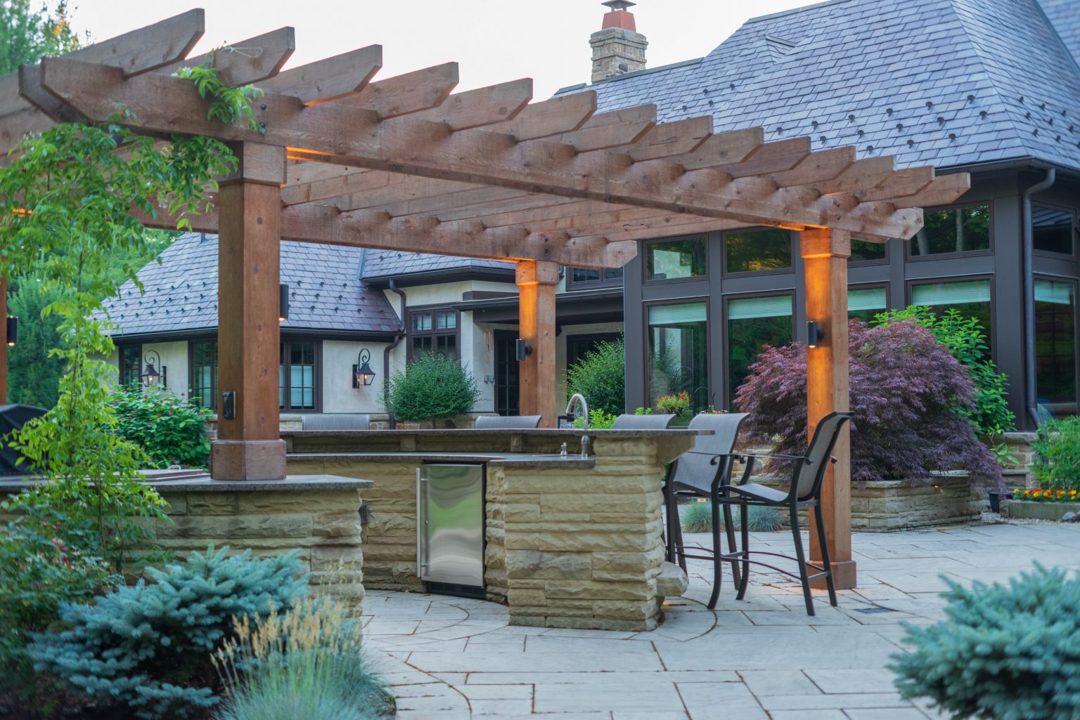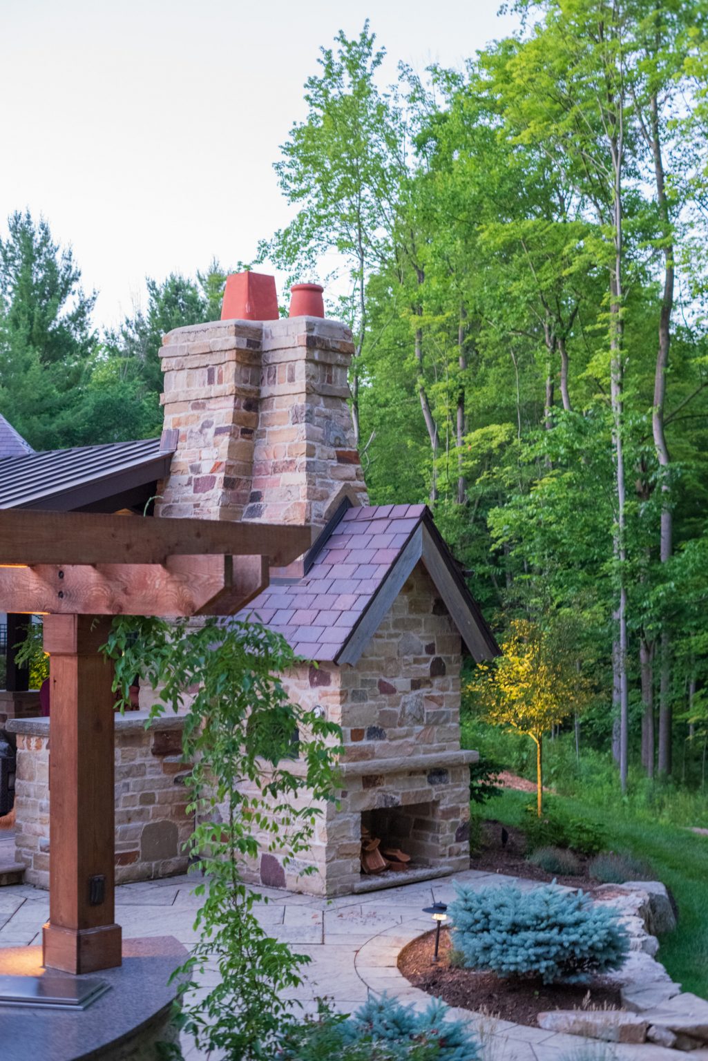 County Line Estate’s long, winding driveway leads to a large turnaround and fabricated sandstone drop-off spaces at the front of the home. Layered planting beds featuring salvaged stone elements were designed to emphasize the home’s impressive architecture, an effect further enhanced by extensive LED and gas lighting.