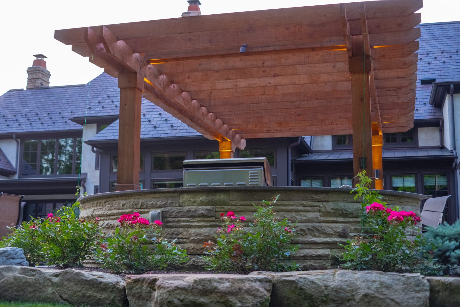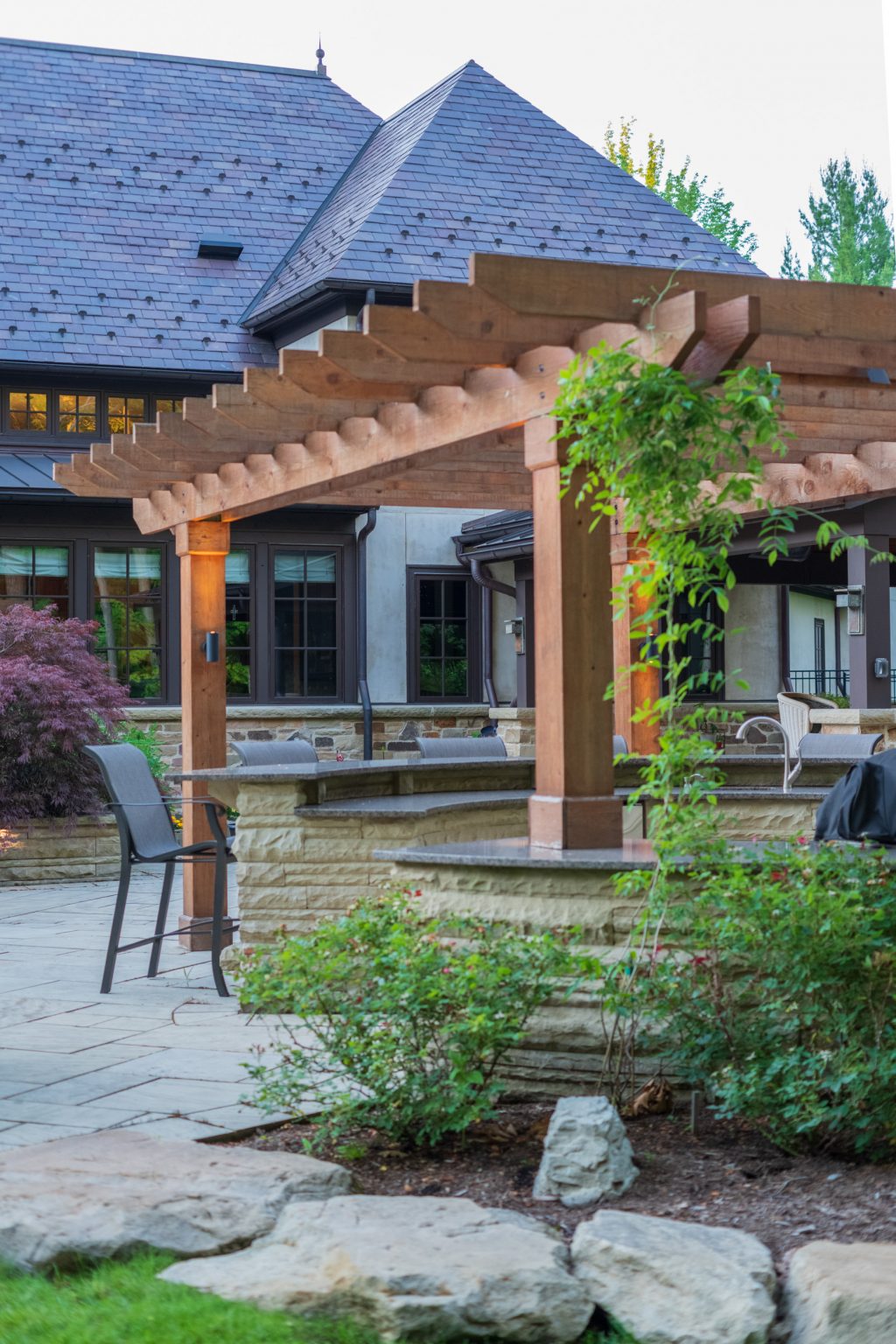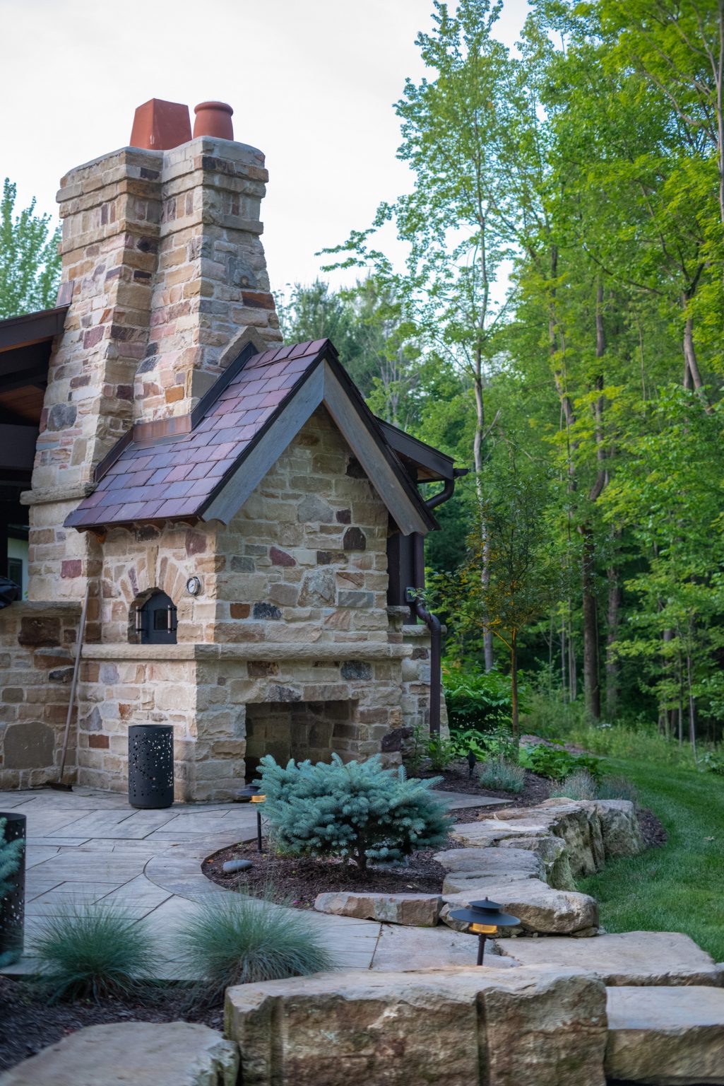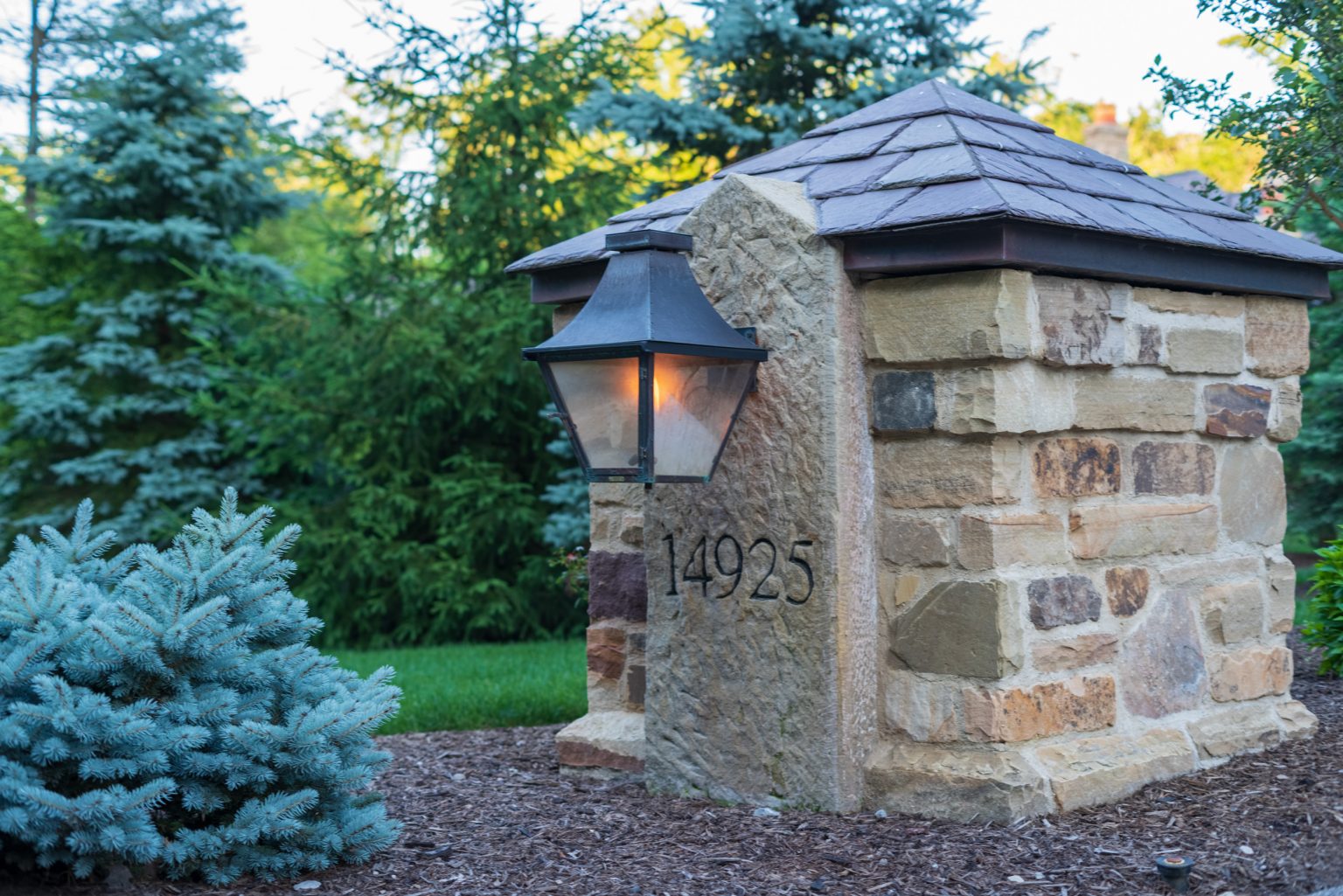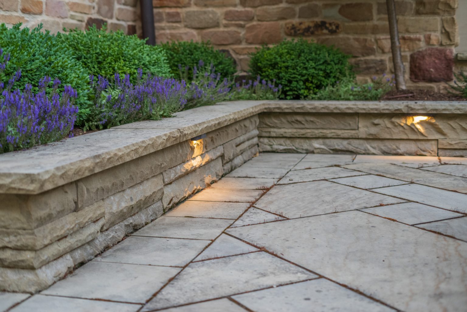 County Line Estate’s long, winding driveway leads to a large turnaround and fabricated sandstone drop-off spaces at the front of the home. Layered planting beds featuring salvaged stone elements were designed to emphasize the home’s impressive architecture, an effect further enhanced by extensive LED and gas lighting.