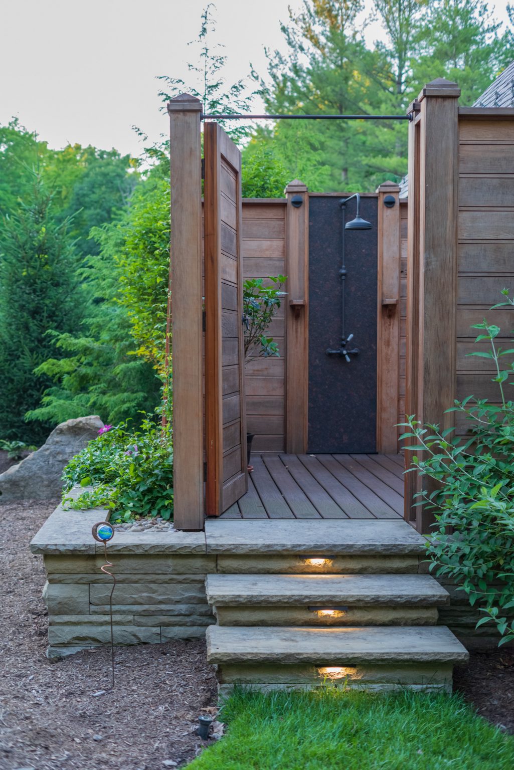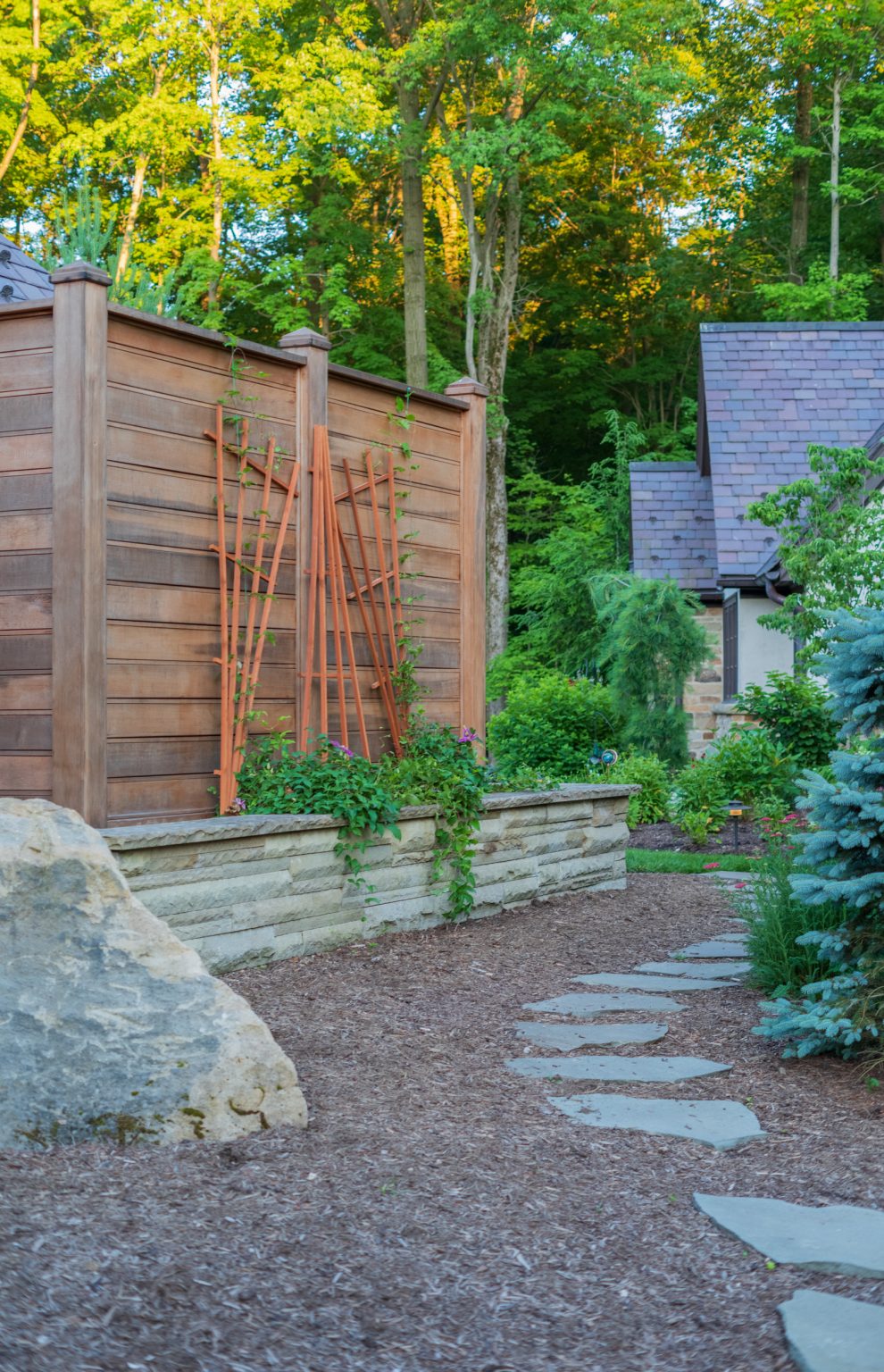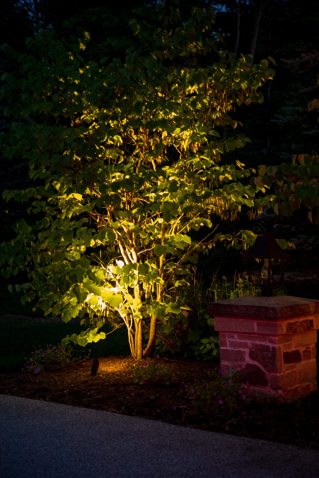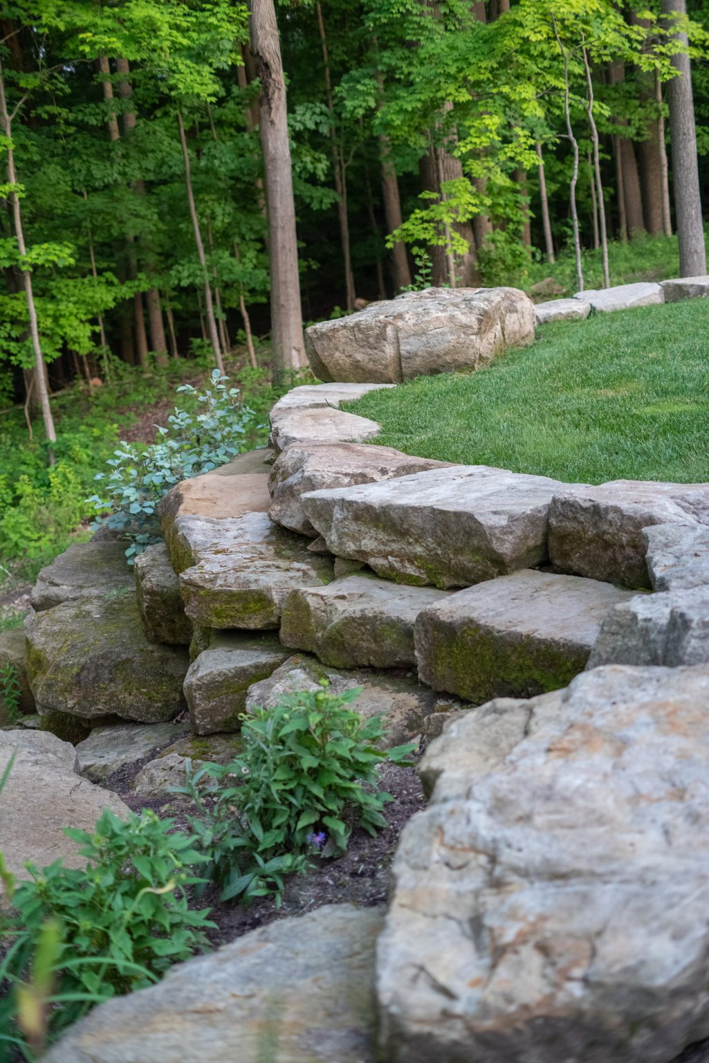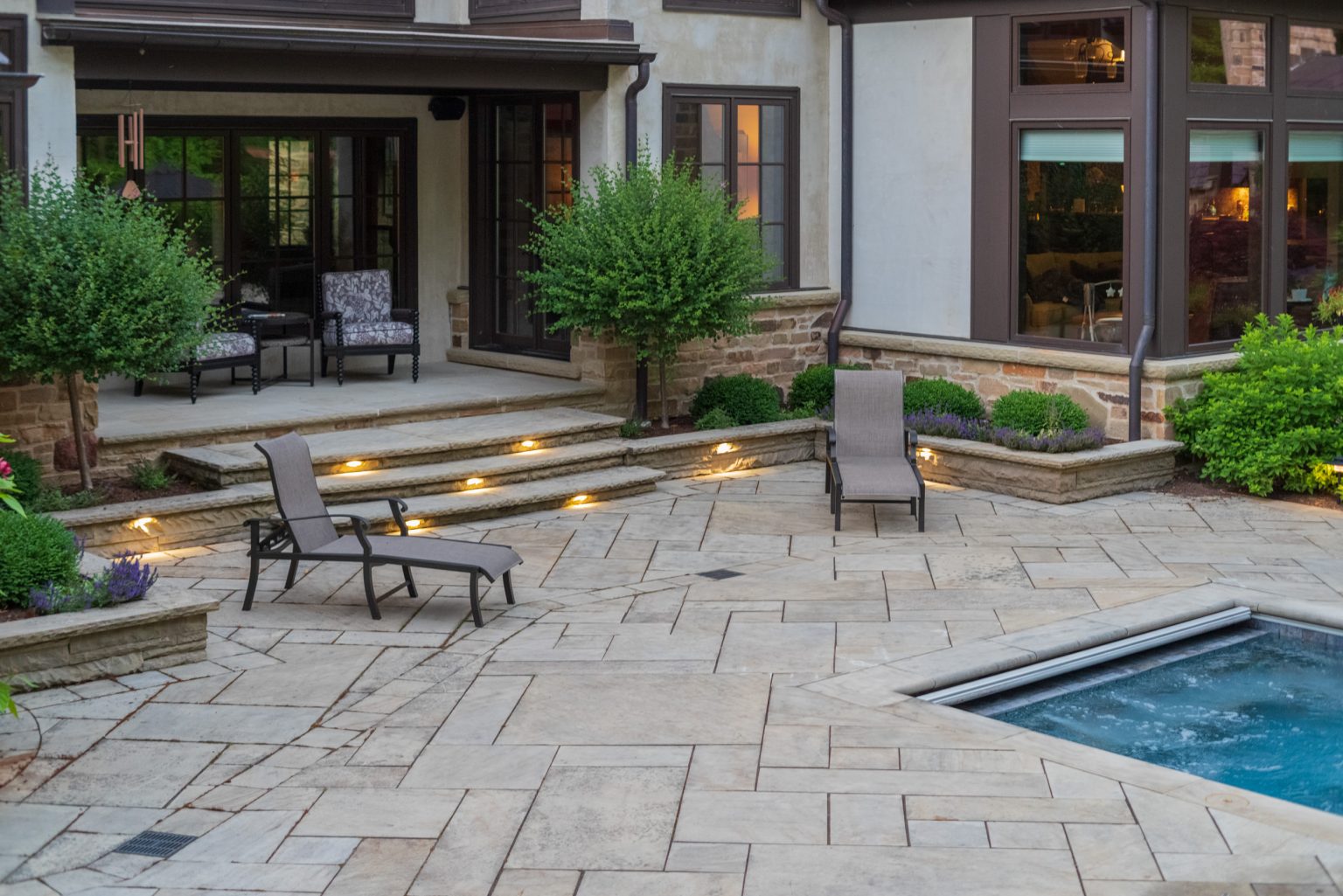 County Line Estate’s long, winding driveway leads to a large turnaround and fabricated sandstone drop-off spaces at the front of the home. Layered planting beds featuring salvaged stone elements were designed to emphasize the home’s impressive architecture, an effect further enhanced by extensive LED and gas lighting.