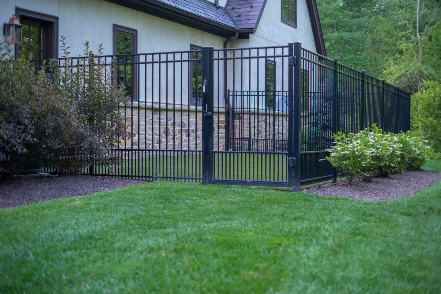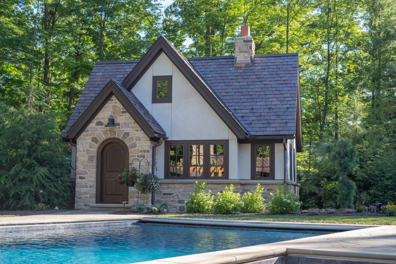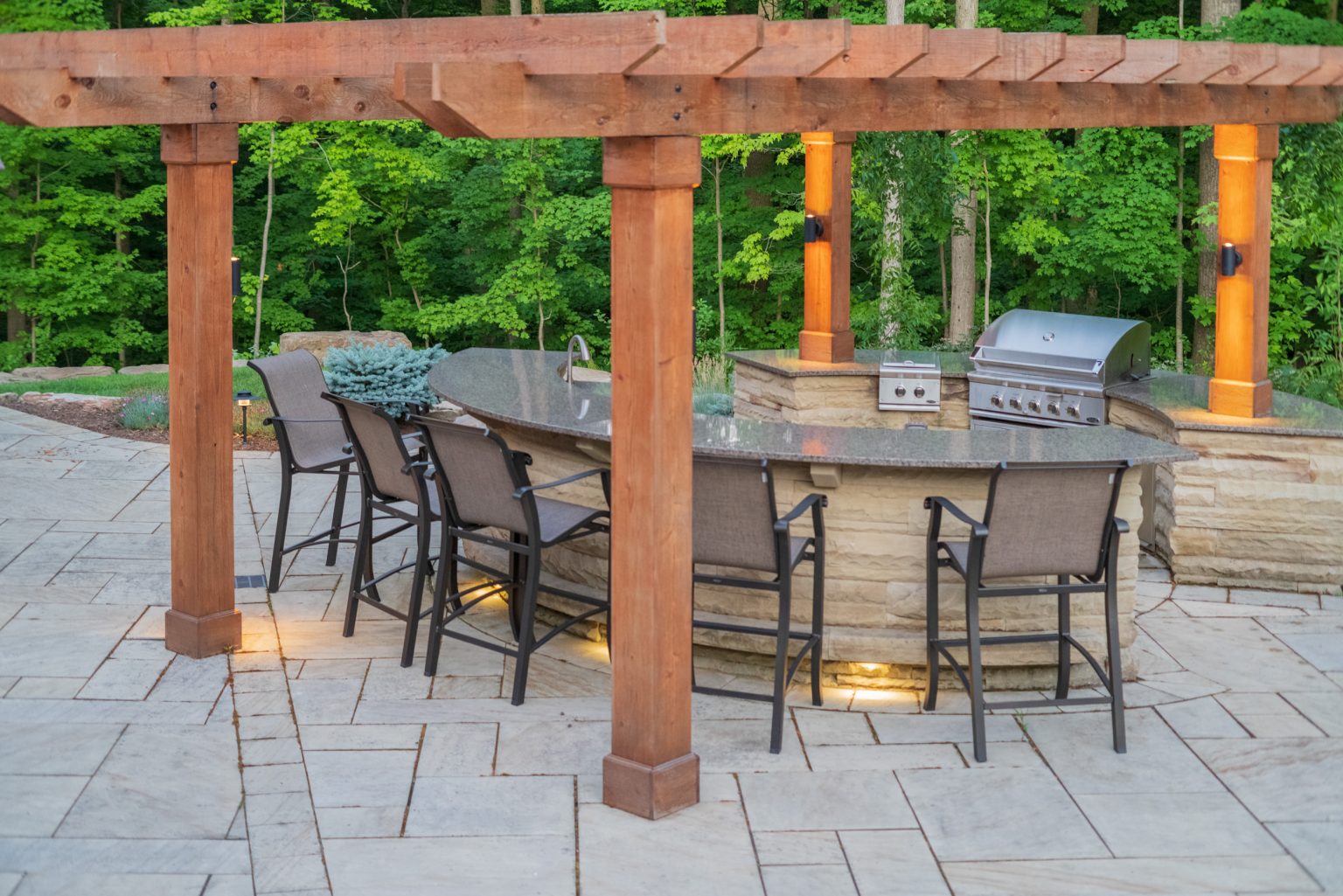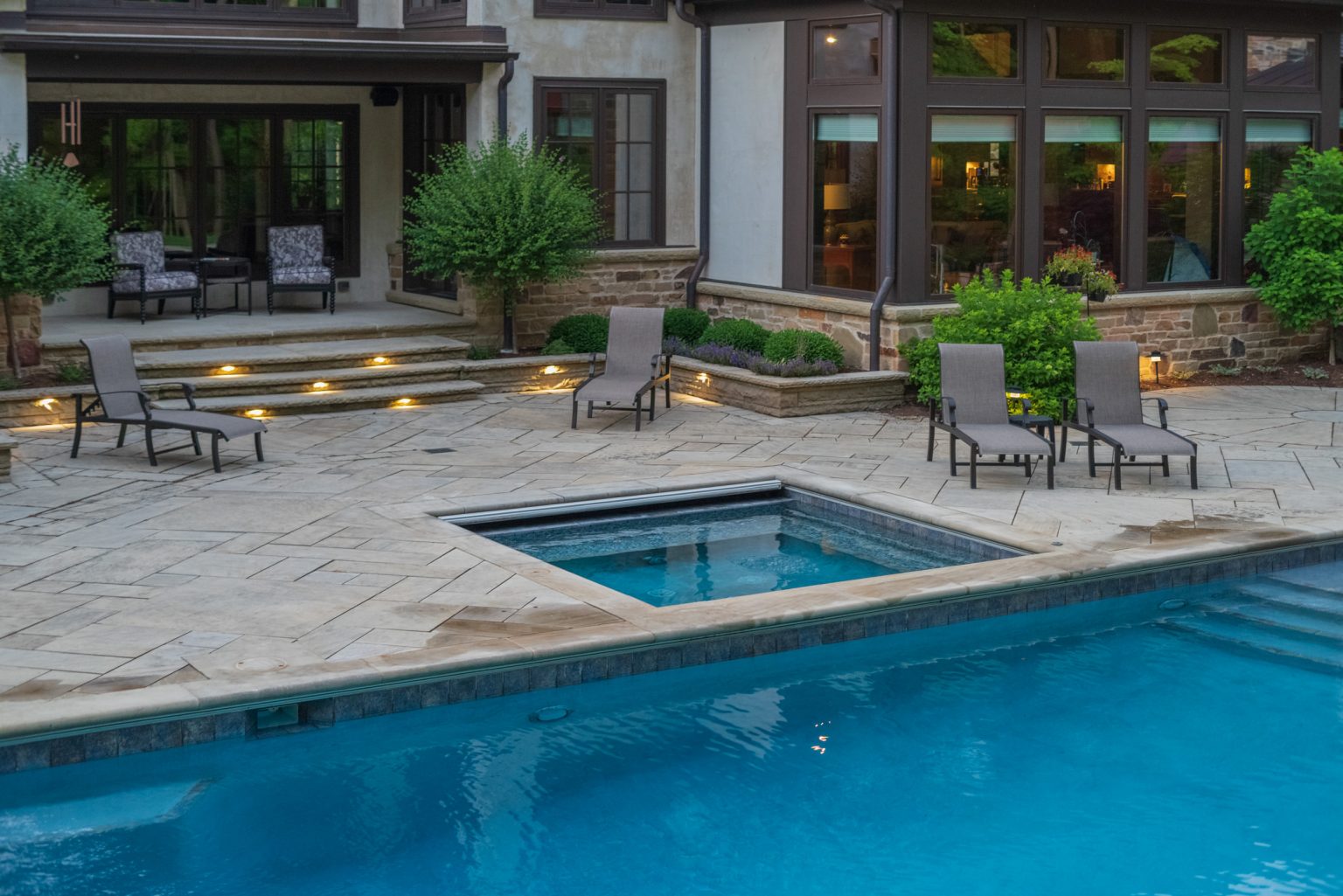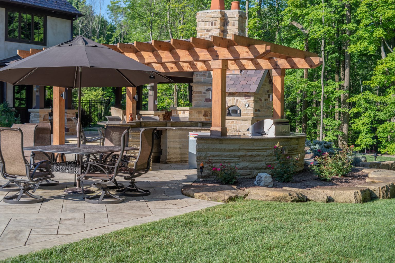 County Line Estate’s long, winding driveway leads to a large turnaround and fabricated sandstone drop-off spaces at the front of the home. Layered planting beds featuring salvaged stone elements were designed to emphasize the home’s impressive architecture, an effect further enhanced by extensive LED and gas lighting.
