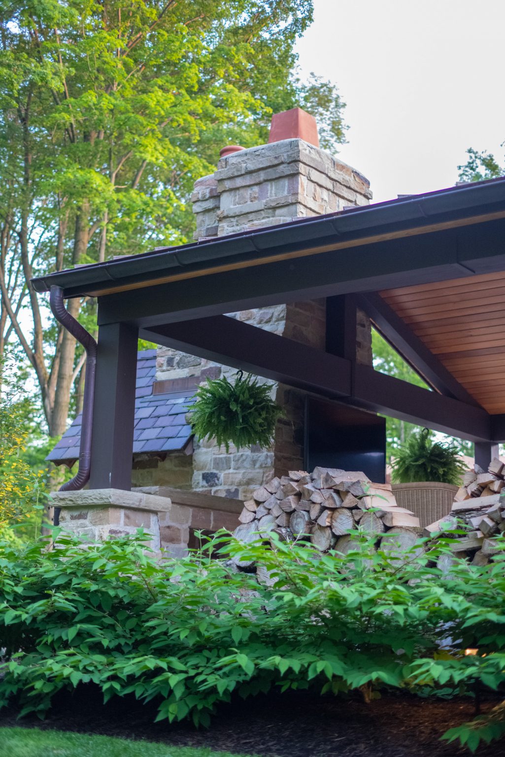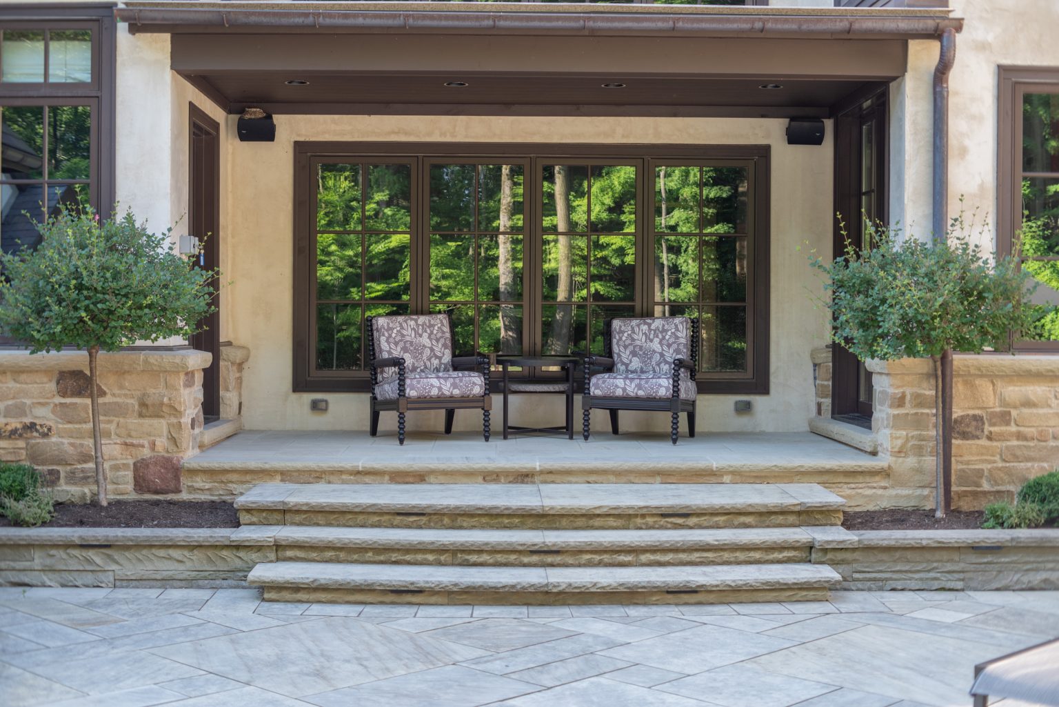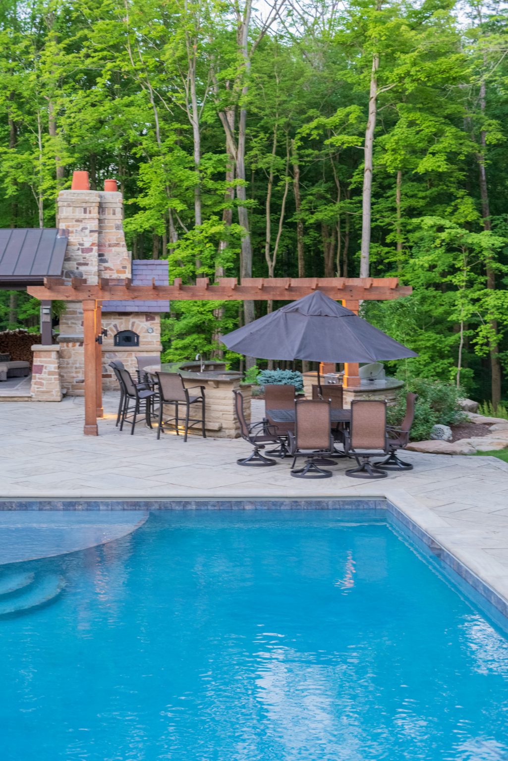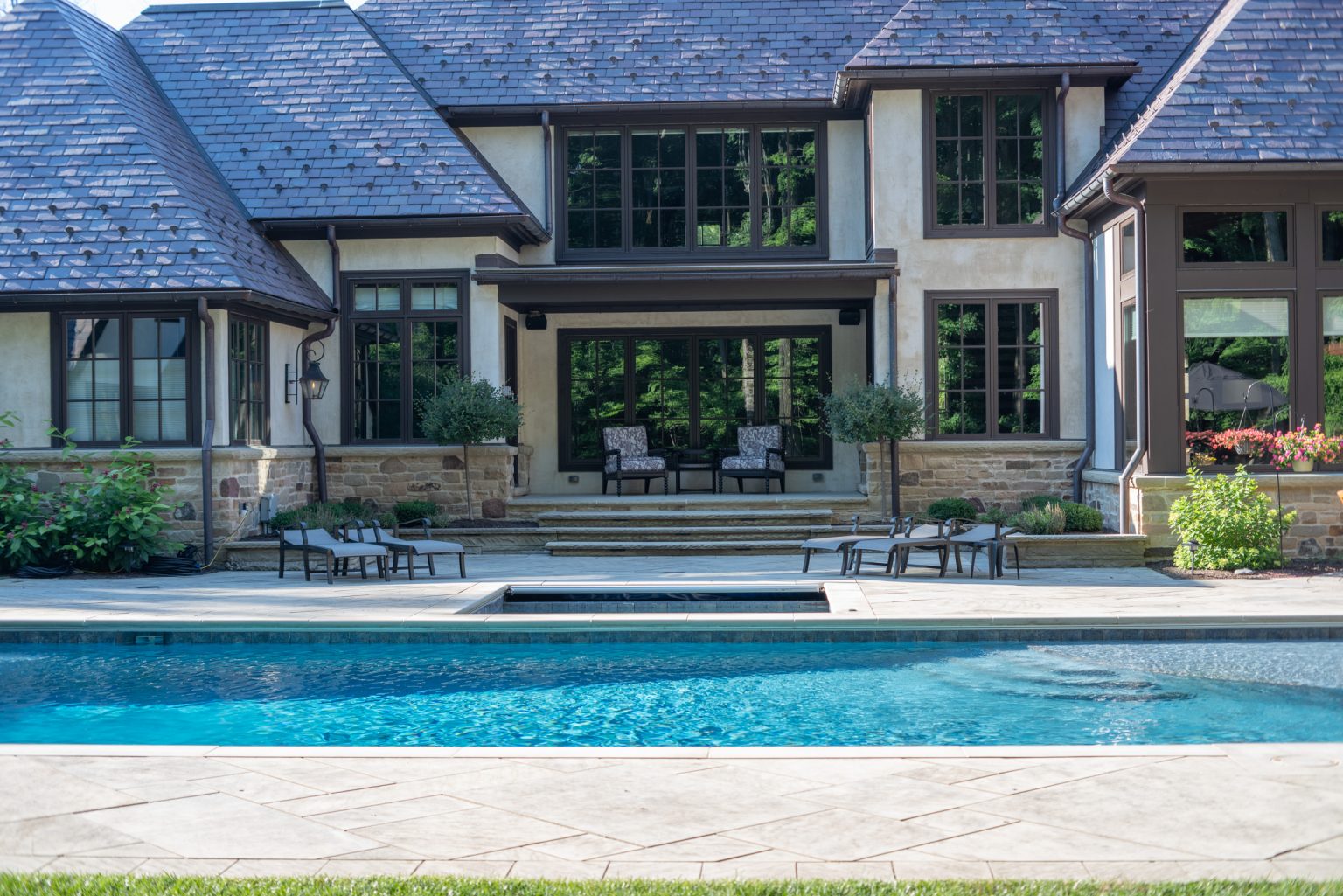 Hidden from views by mature evergreen screenings, County Line Estate also features an impressive, backyard entertainment terrace featuring an inground pool and spa, covered and open-air dining spaces, an outdoor shower, and a coordinating pool house, by others. To create this space, KGK developed a extensive drainage plan including underground detention basins and swales to avoid flooding the woodlands during large storm events. Maintaining clear views to the surrounding woods line, KGK worked in tandem with other architects and contractors to create multiple outdoor rooms designed with function and aesthetics in mind. Sandstone paving and wall elements were repeated throughout, tying the design together.