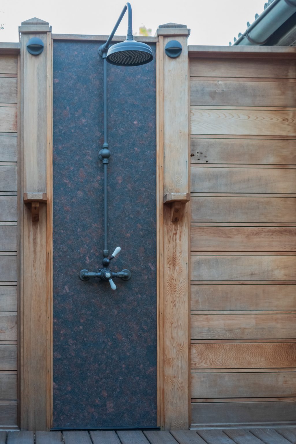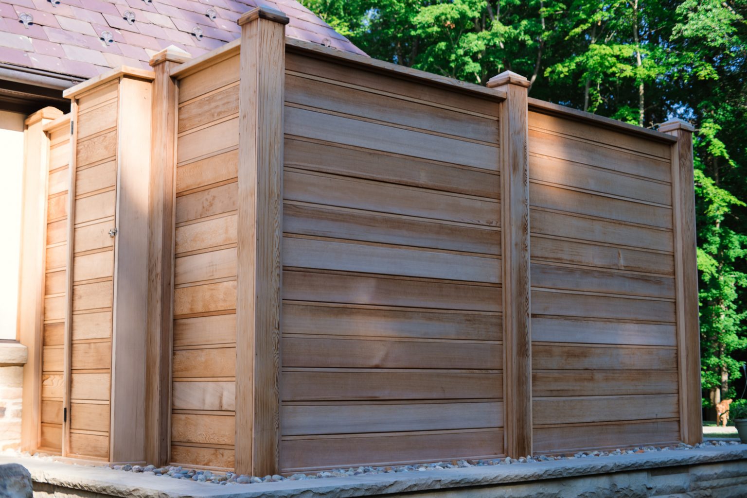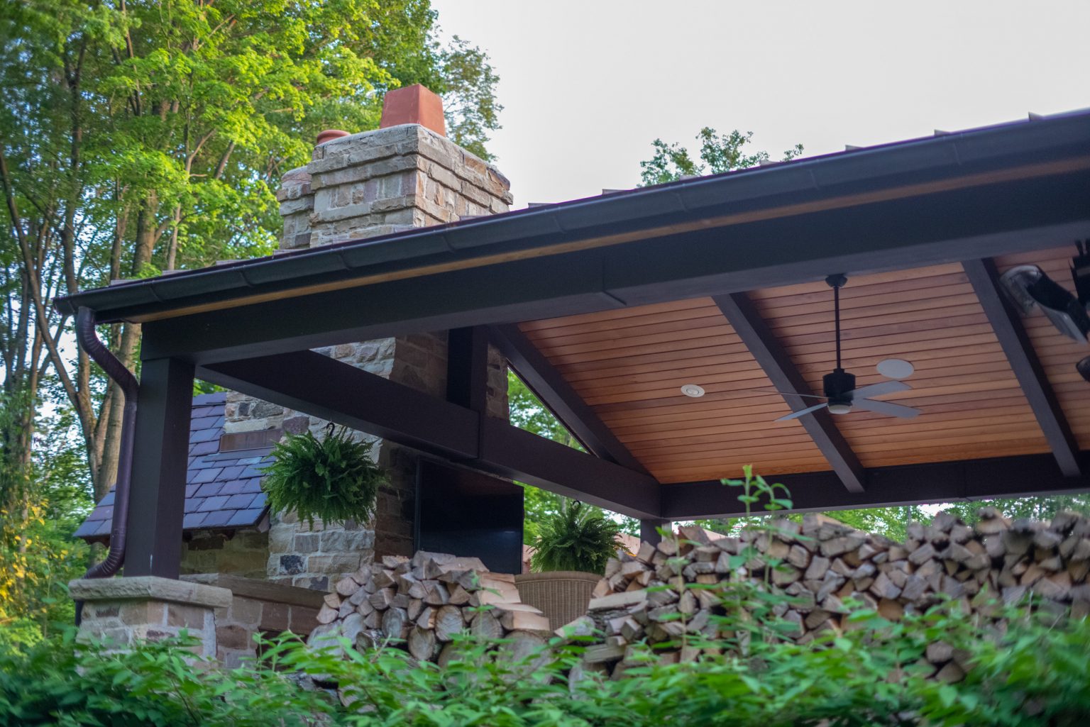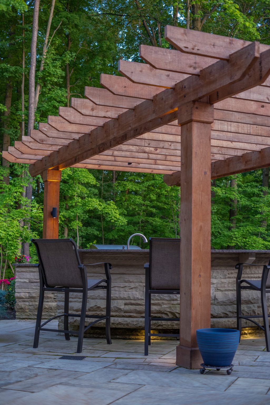 Hidden from views by mature evergreen screenings, County Line Estate also features an impressive, backyard entertainment terrace featuring an inground pool and spa, covered and open-air dining spaces, an outdoor shower, and a coordinating pool house, by others. To create this space, KGK developed a extensive drainage plan including underground detention basins and swales to avoid flooding the woodlands during large storm events. Maintaining clear views to the surrounding woods line, KGK worked in tandem with other architects and contractors to create multiple outdoor rooms designed with function and aesthetics in mind. Sandstone paving and wall elements were repeated throughout, tying the design together.