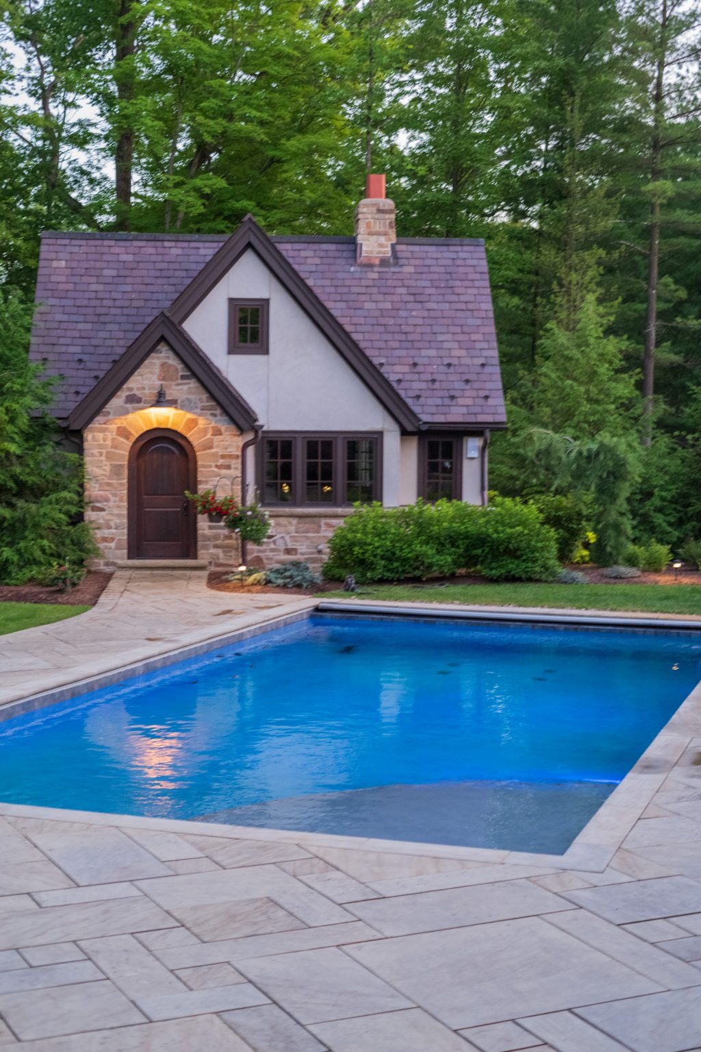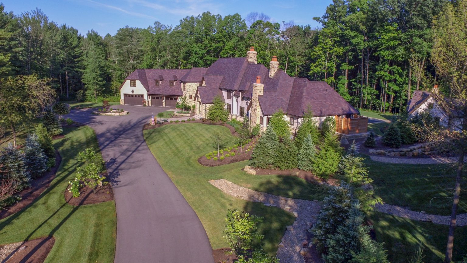 Nestled in the old growth forest in the Chagrin Valley lies the County Line Estate, a comprehensive design-build project led by the design team at KGK. Guests to the property are first welcomed by strategically lit, tree-lined perimeter beds. Framing the entry are masonry stone columns featuring warmly lit gas sconces. Finishes and details throughout this project were heavily influenced by the home’s French Country architecture.