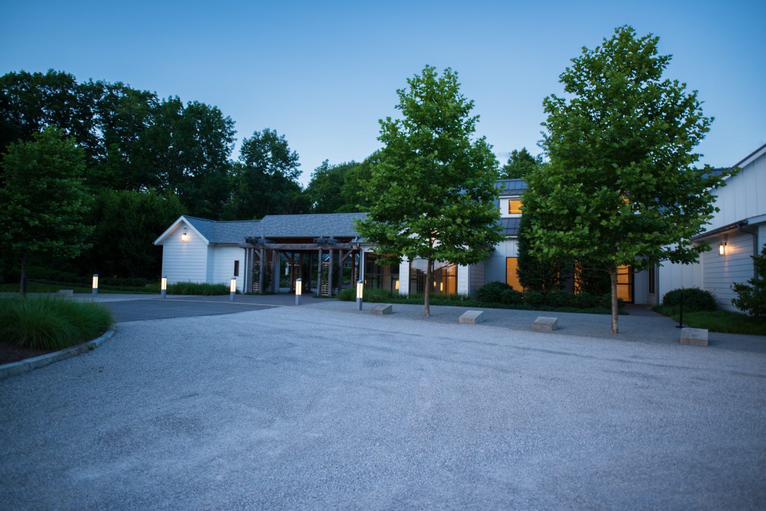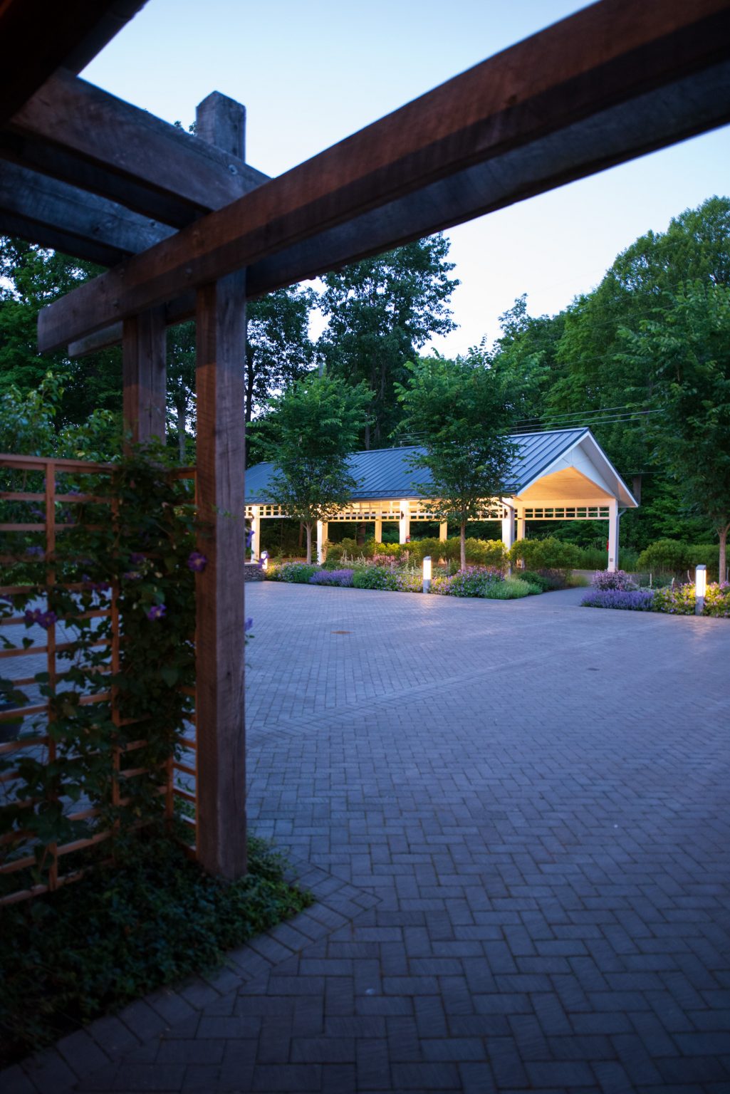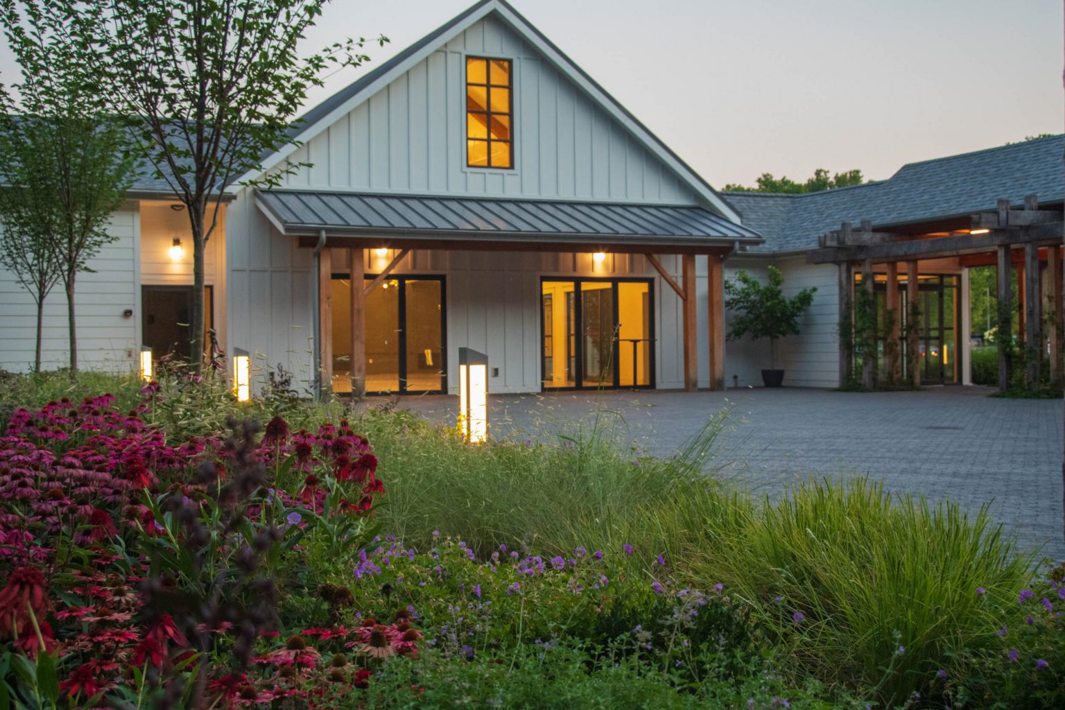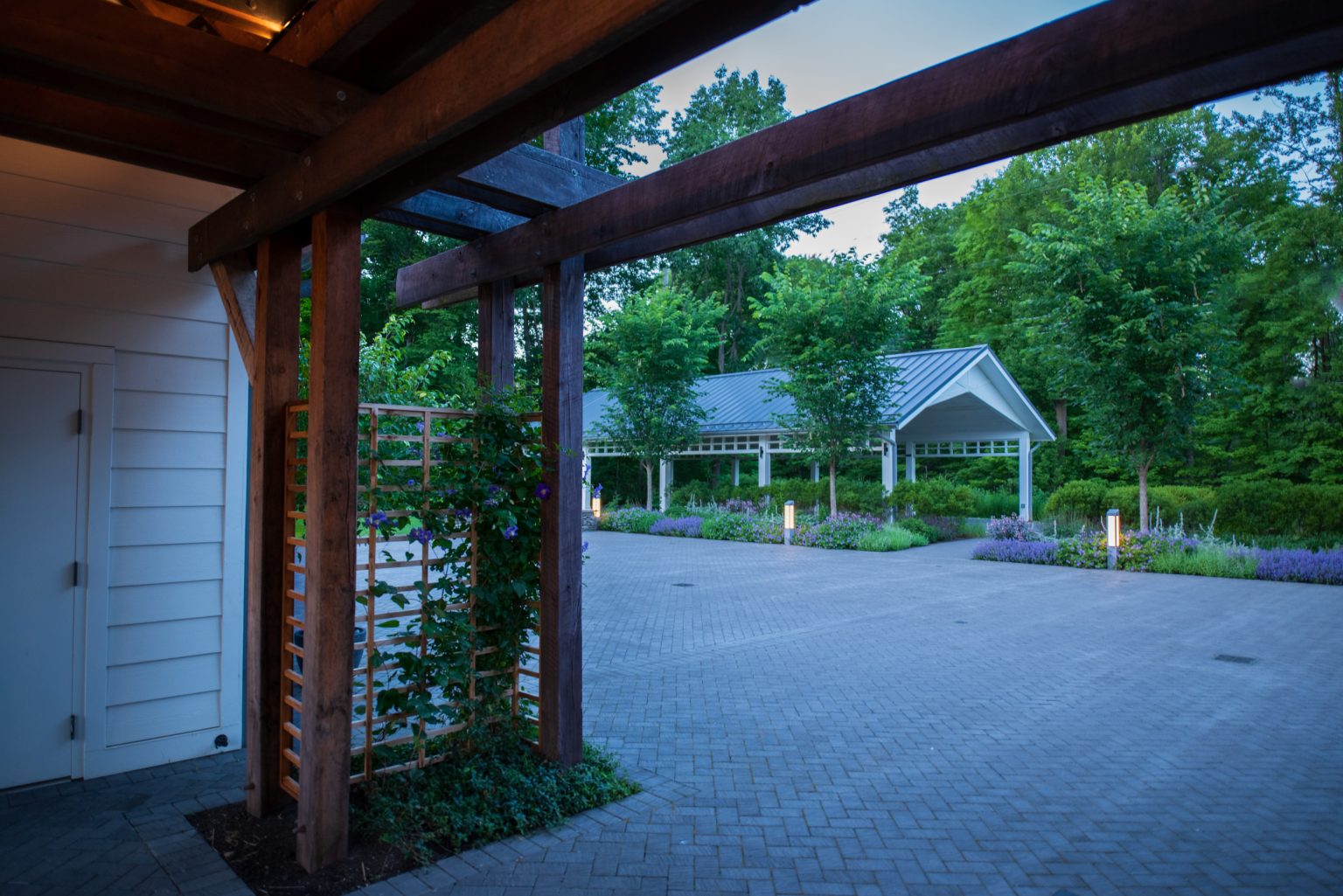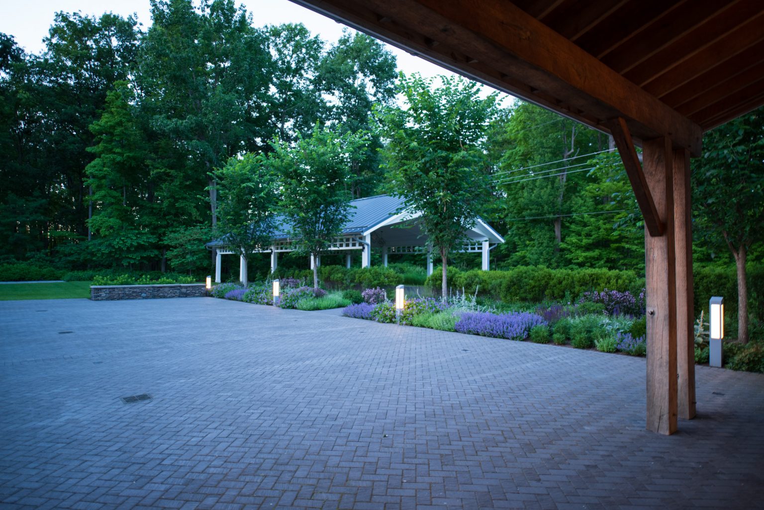 Highfields Event Center was created to share the beauty of this second- generation farmland with the community in a much-needed venue beautiful enough to match the surrounding grounds. Working closely with the DS Architects Design Team, KGK developed a comprehensive site plan connecting indoors and out. Guests are welcomed to the property by a circular sign bed featuring a gabion wall with illuminated Corten steel sign and lush plantings. Circulating around the Entry Auto Court, visitors pass by the native meadow bioswale before reaching the center’s entry terrace. Simple tree and foundation plantings were selected to allow Highfield’s architectural details to be the focus of attention. Bollard light fixtures, sandstone curbing, and the rough-sawn cedar pergola blend new and old to create a truly unique venue entrance.