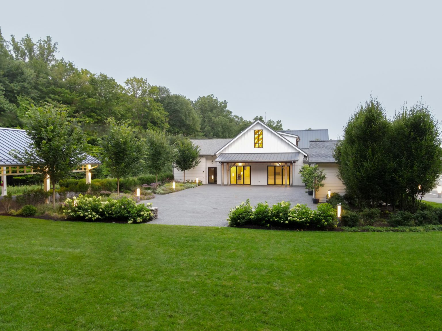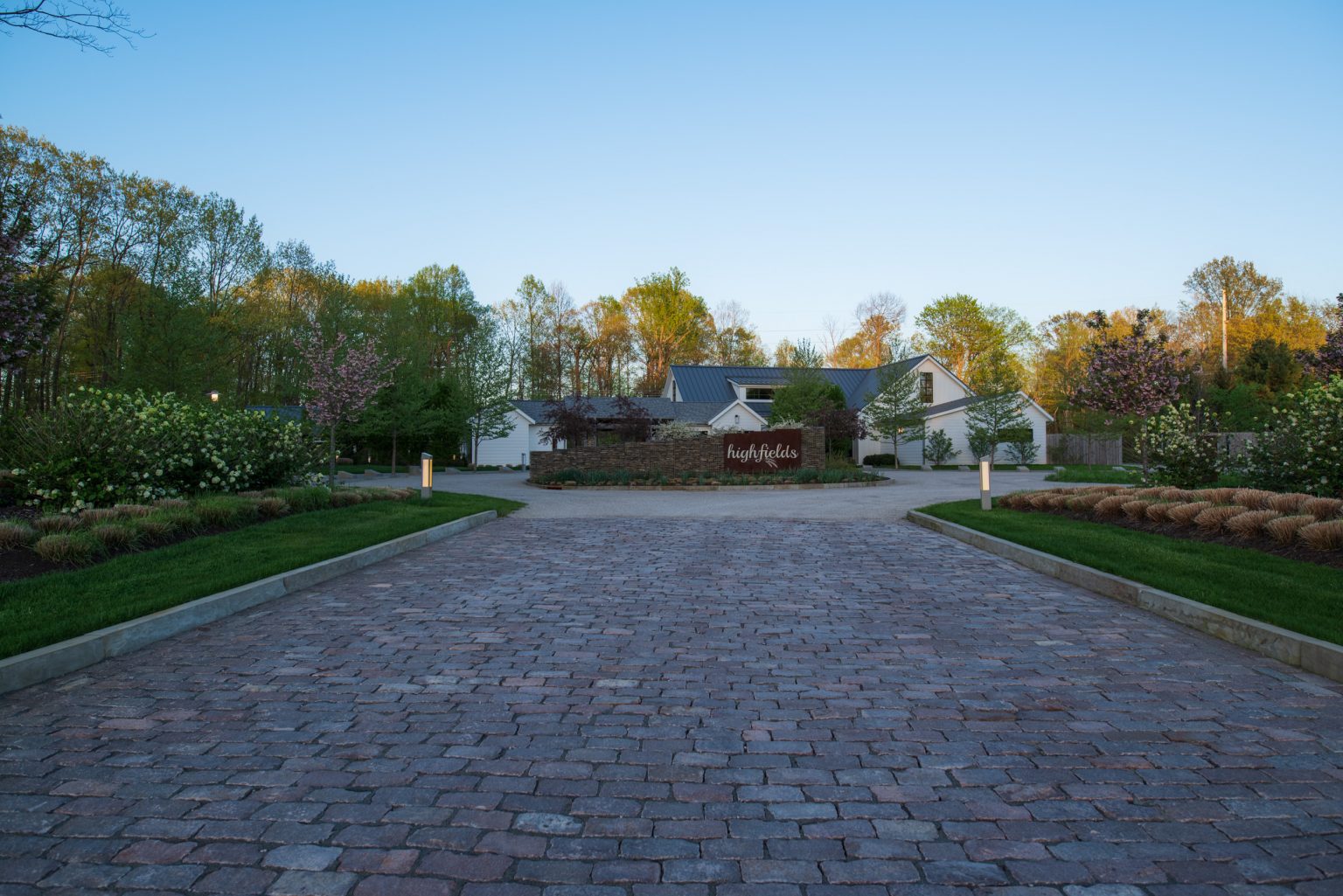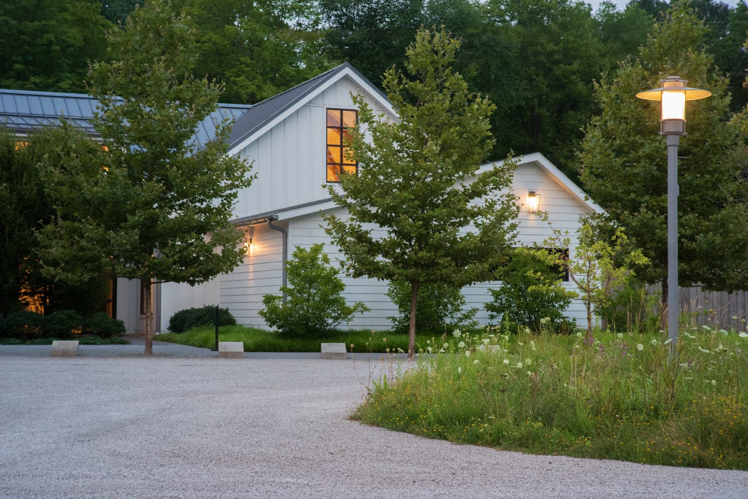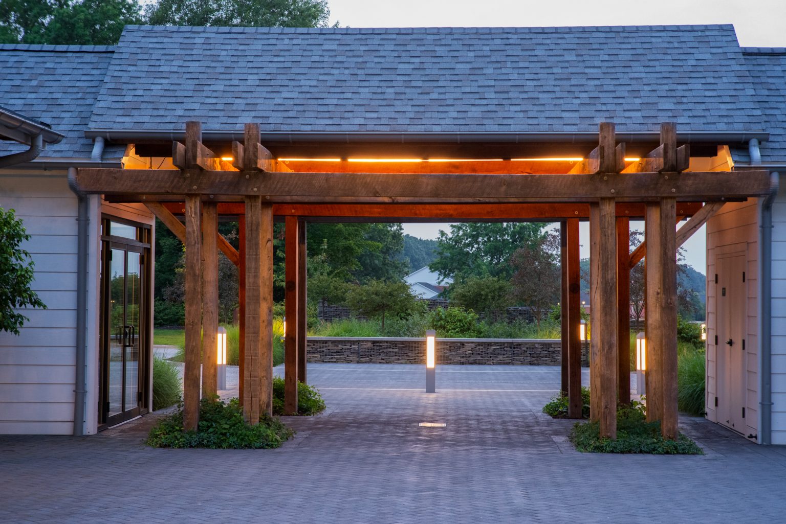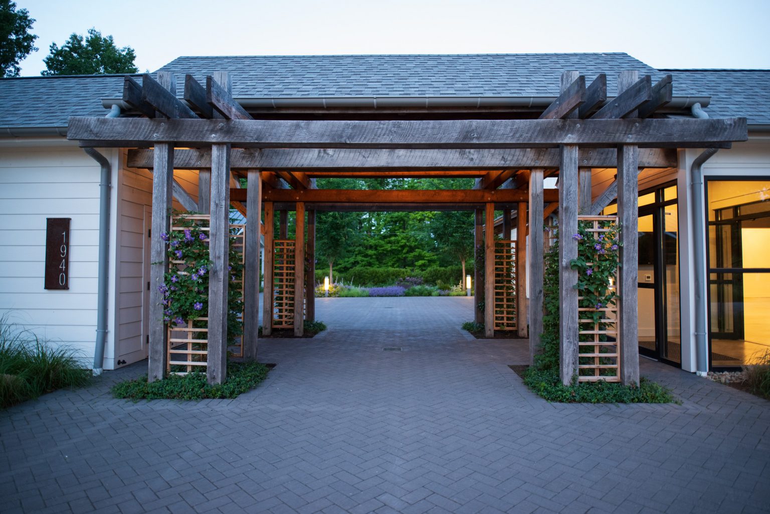 Highfields Event Center was created to share the beauty of this second- generation farmland with the community in a much-needed venue beautiful enough to match the surrounding grounds. Working closely with the DS Architects Design Team, KGK developed a comprehensive site plan connecting indoors and out. Guests are welcomed to the property by a circular sign bed featuring a gabion wall with illuminated Corten steel sign and lush plantings. Circulating around the Entry Auto Court, visitors pass by the native meadow bioswale before reaching the center’s entry terrace. Simple tree and foundation plantings were selected to allow Highfield’s architectural details to be the focus of attention. Bollard light fixtures, sandstone curbing, and the rough-sawn cedar pergola blend new and old to create a truly unique venue entrance.