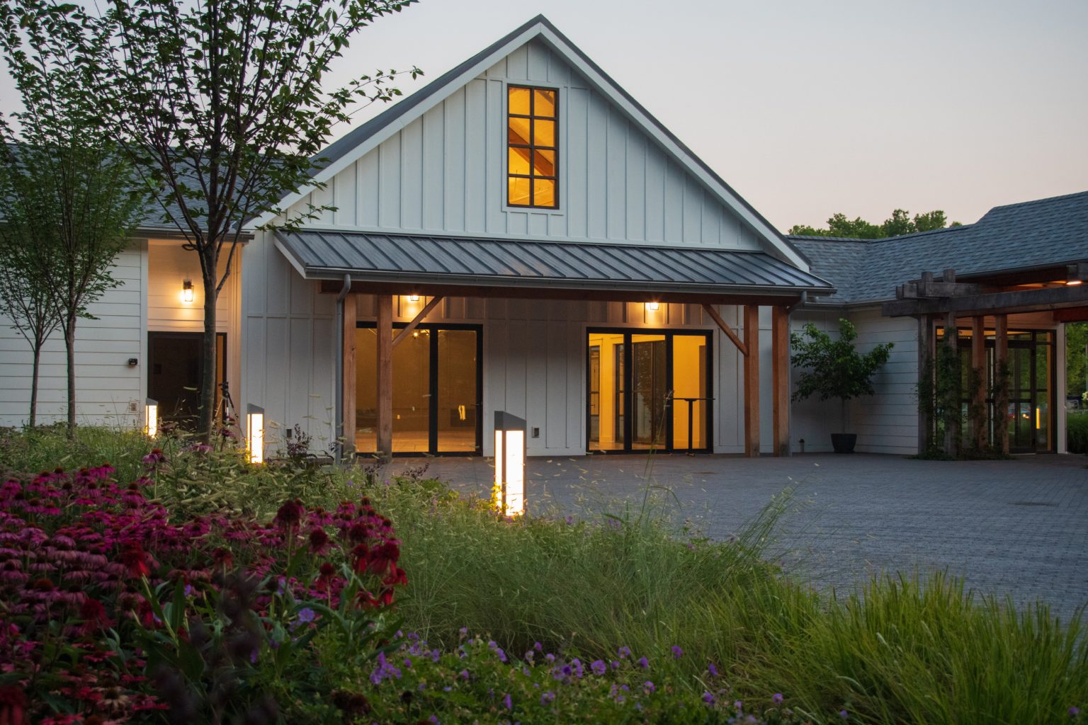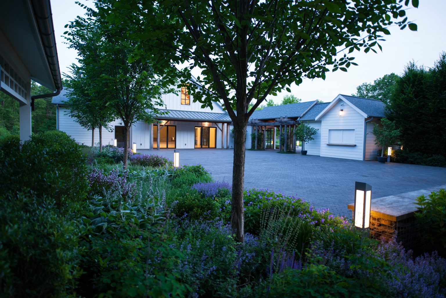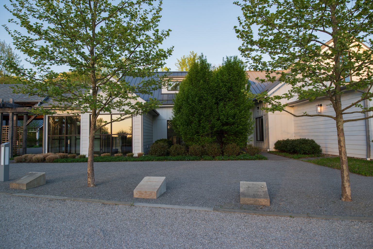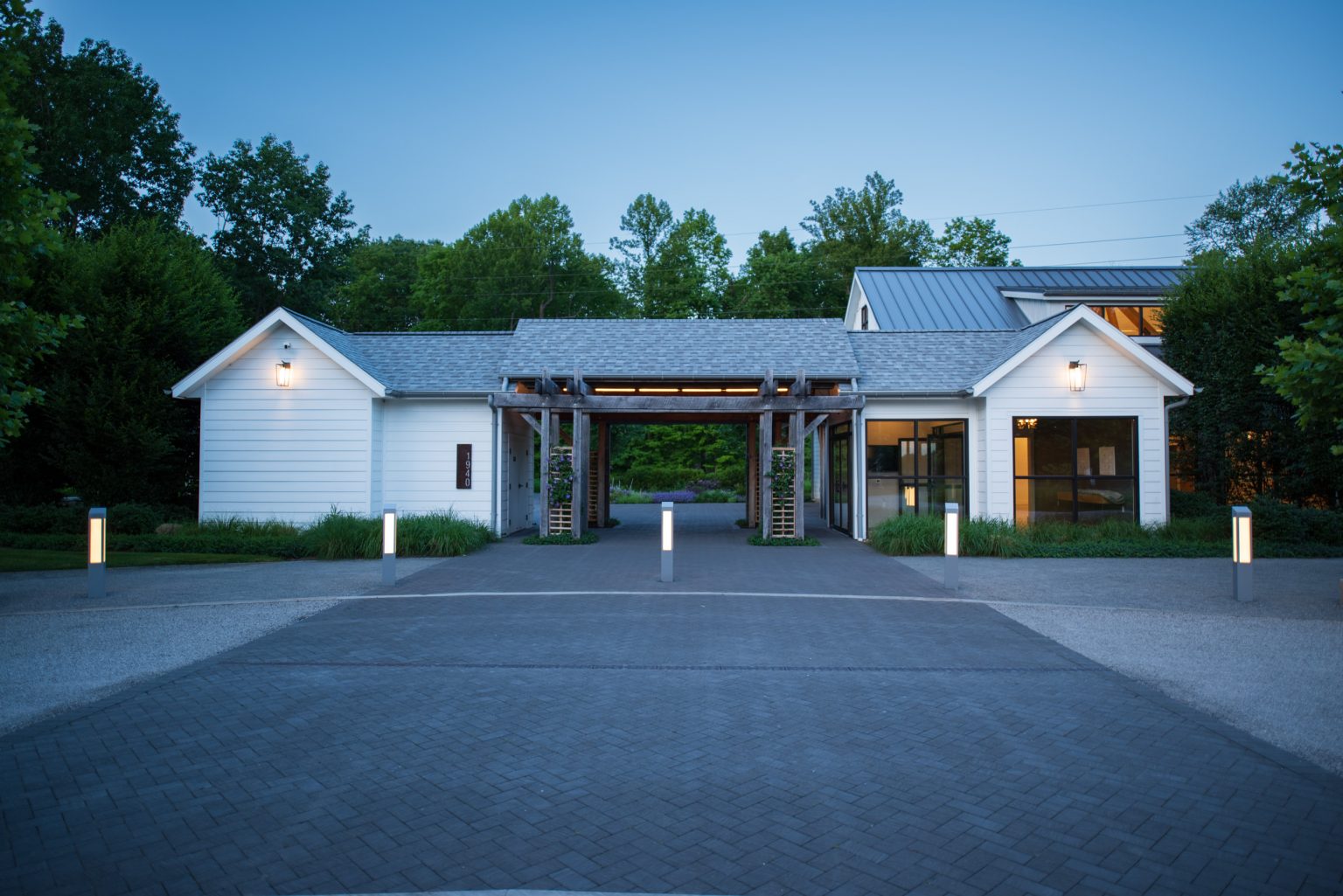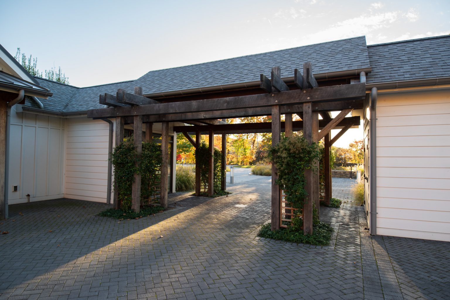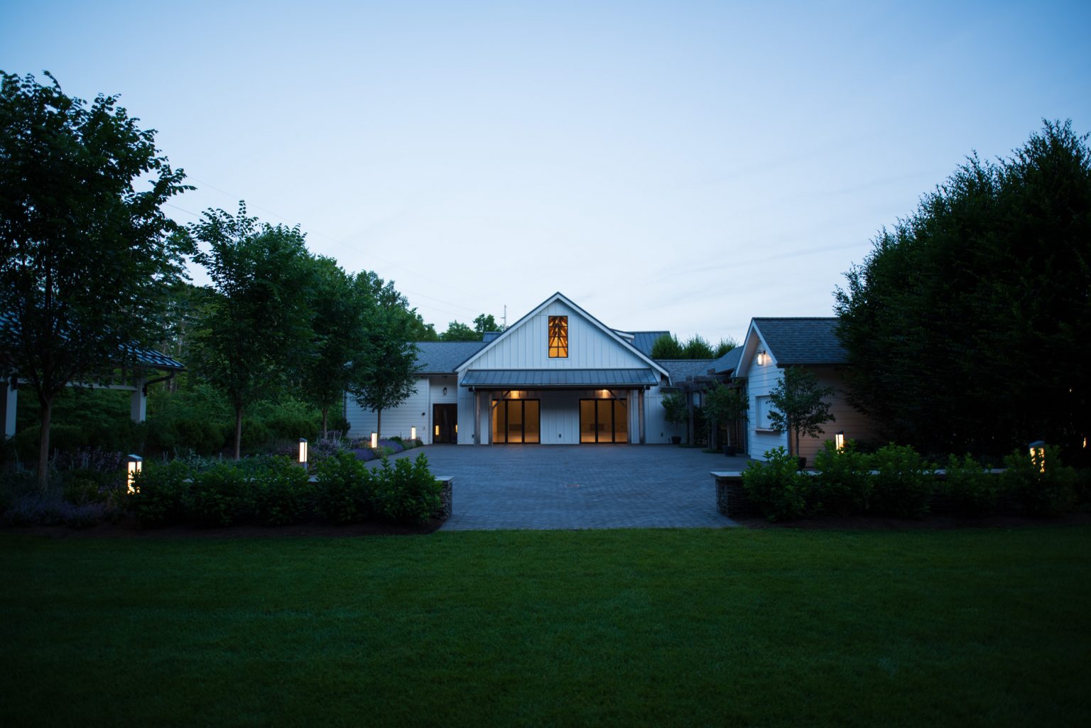 Highfields Event Center was created to share the beauty of this second- generation farmland with the community in a much-needed venue beautiful enough to match the surrounding grounds. Working closely with the DS Architects Design Team, KGK developed a comprehensive site plan connecting indoors and out. Guests are welcomed to the property by a circular sign bed featuring a gabion wall with illuminated Corten steel sign and lush plantings. Circulating around the Entry Auto Court, visitors pass by the native meadow bioswale before reaching the center’s entry terrace. Simple tree and foundation plantings were selected to allow Highfield’s architectural details to be the focus of attention. Bollard light fixtures, sandstone curbing, and the rough-sawn cedar pergola blend new and old to create a truly unique venue entrance.