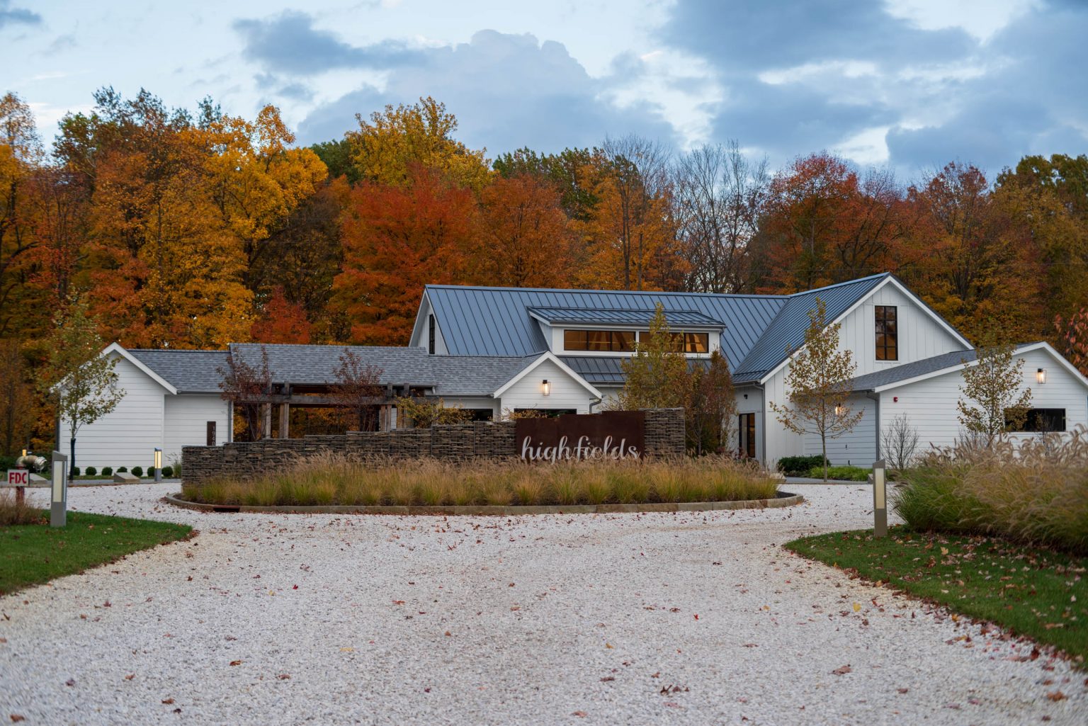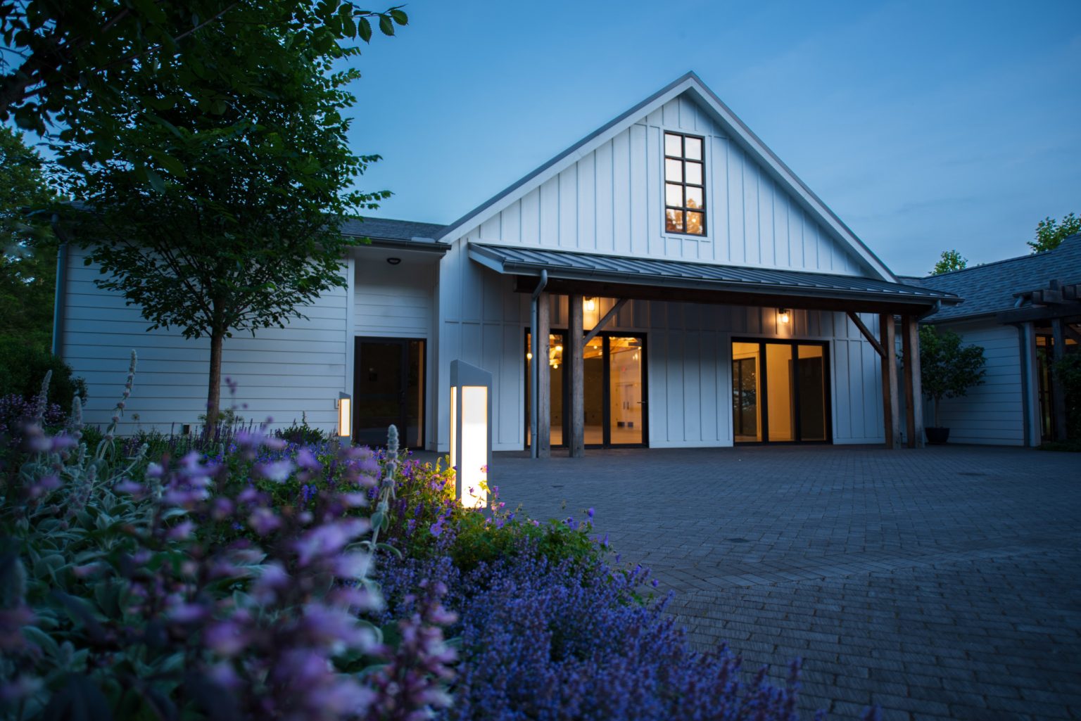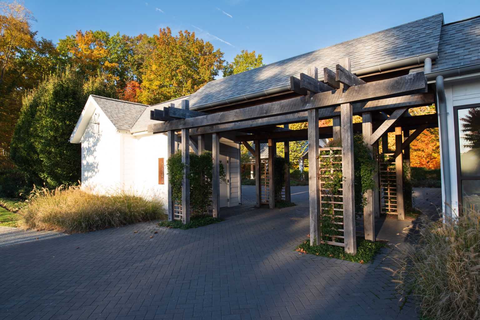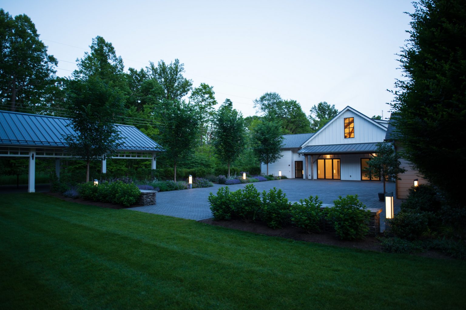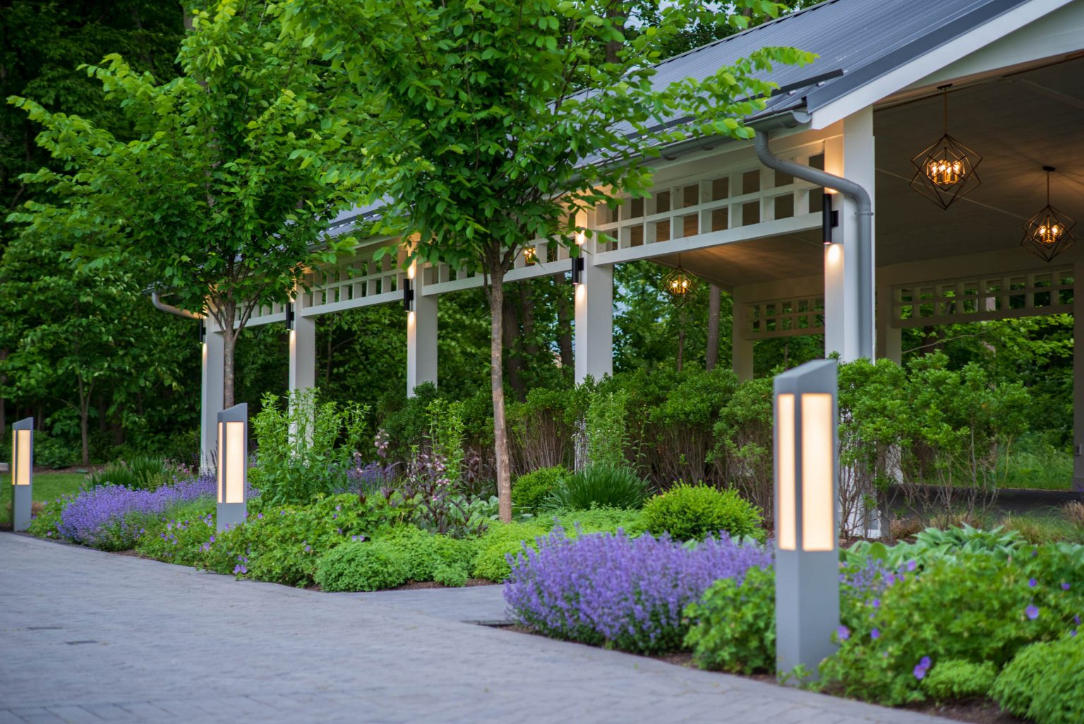 Highfields Event Center was created to share the beauty of this second- generation farmland with the community in a much-needed venue beautiful enough to match the surrounding grounds. Working closely with the DS Architects Design Team, KGK developed a comprehensive site plan connecting indoors and out. Guests are welcomed to the property by a circular sign bed featuring a gabion wall with illuminated Corten steel sign and lush plantings. Circulating around the Entry Auto Court, visitors pass by the native meadow bioswale before reaching the center’s entry terrace. Simple tree and foundation plantings were selected to allow Highfield’s architectural details to be the focus of attention. Bollard light fixtures, sandstone curbing, and the rough-sawn cedar pergola blend new and old to create a truly unique venue entrance.