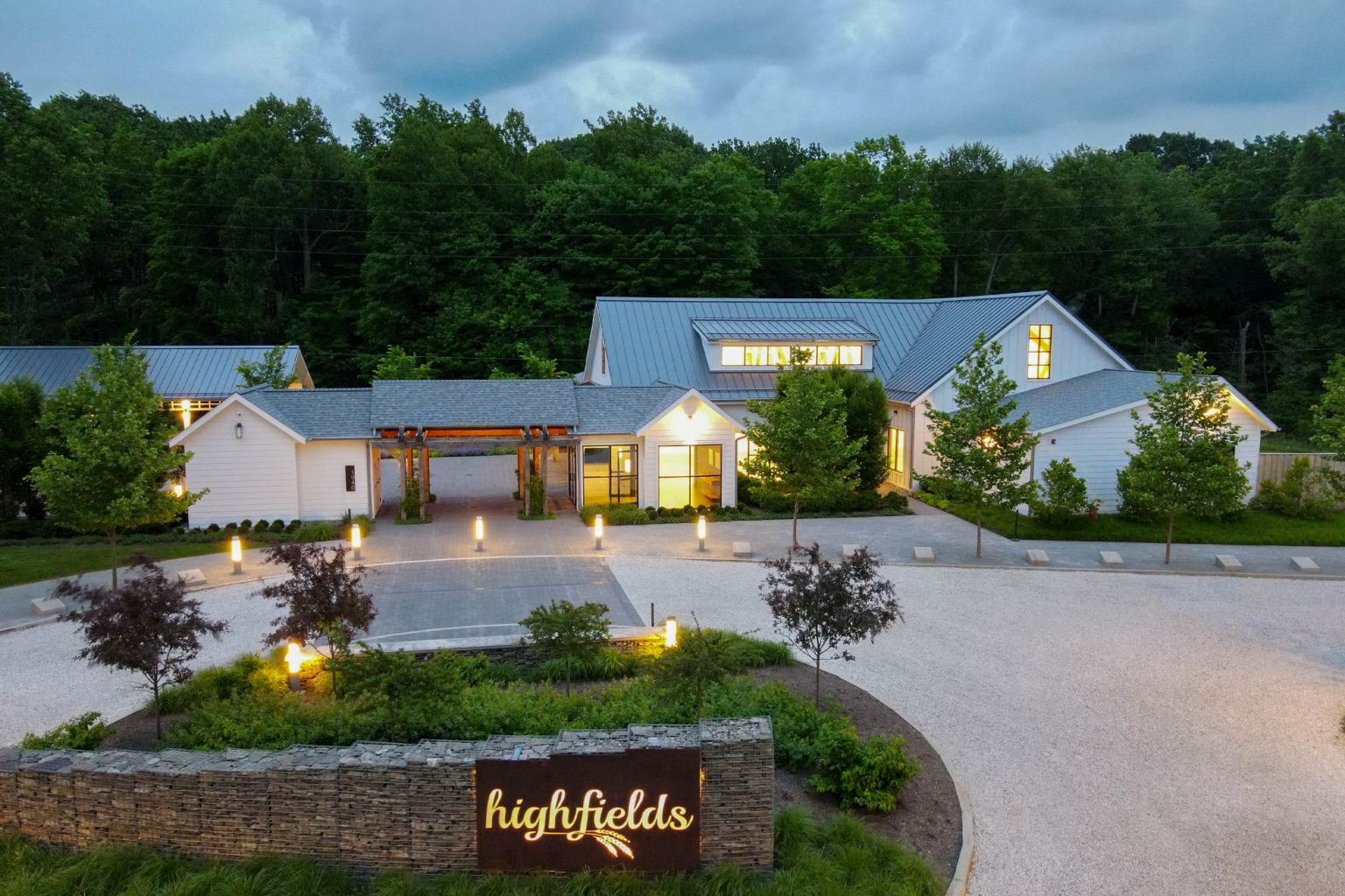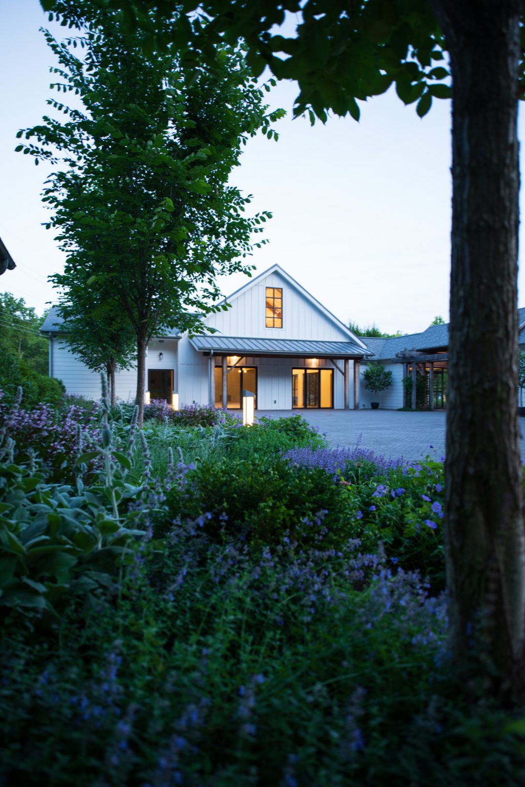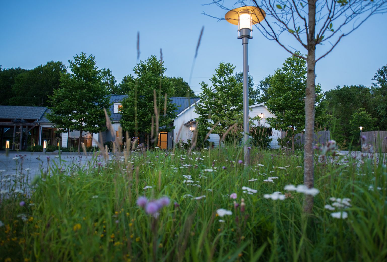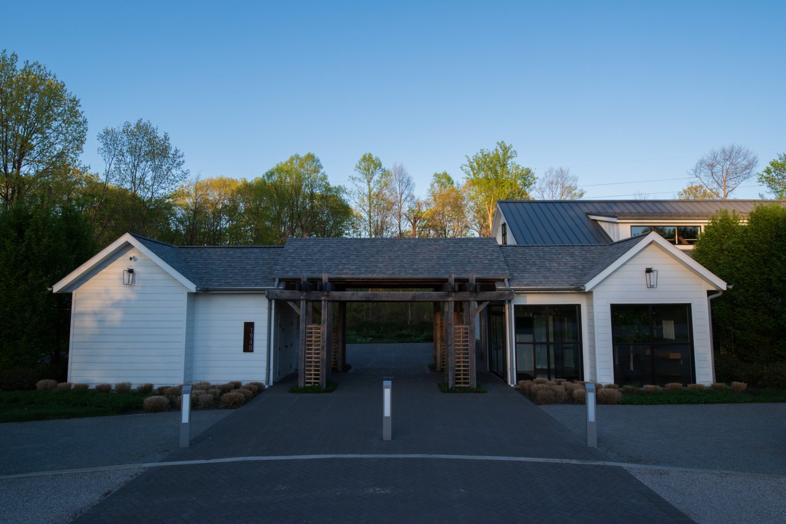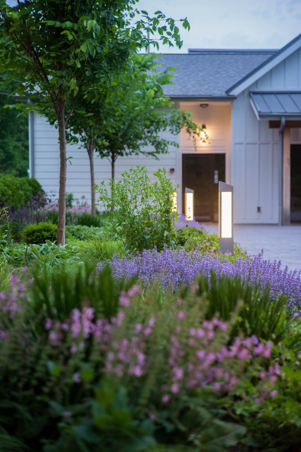 Highfields Event Center was created to share the beauty of this second- generation farmland with the community in a much-needed venue beautiful enough to match the surrounding grounds. Working closely with the DS Architects Design Team, KGK developed a comprehensive site plan connecting indoors and out. Guests are welcomed to the property by a circular sign bed featuring a gabion wall with illuminated Corten steel sign and lush plantings. Circulating around the Entry Auto Court, visitors pass by the native meadow bioswale before reaching the center’s entry terrace. Simple tree and foundation plantings were selected to allow Highfield’s architectural details to be the focus of attention. Bollard light fixtures, sandstone curbing, and the rough-sawn cedar pergola blend new and old to create a truly unique venue entrance.