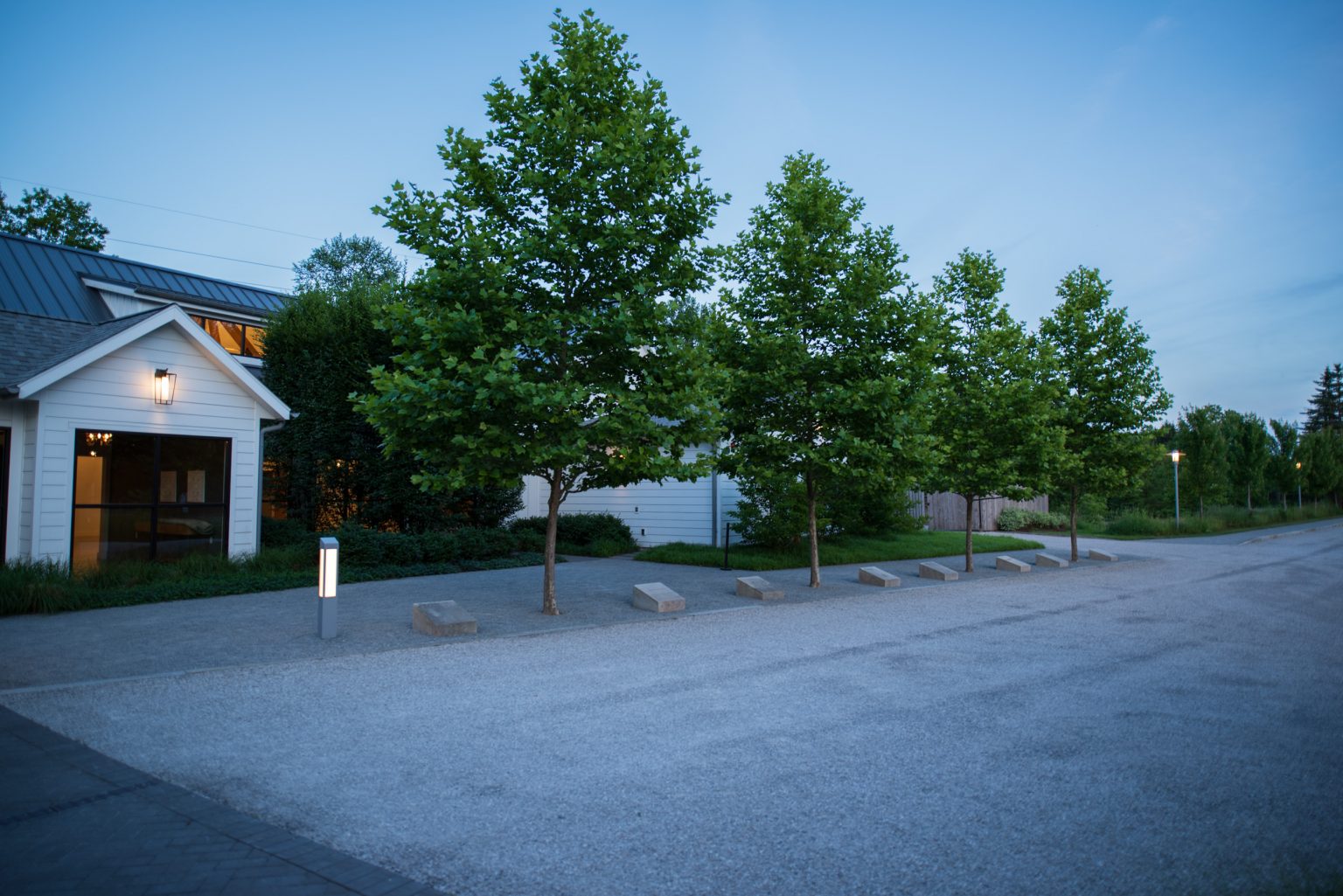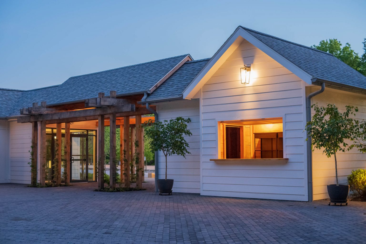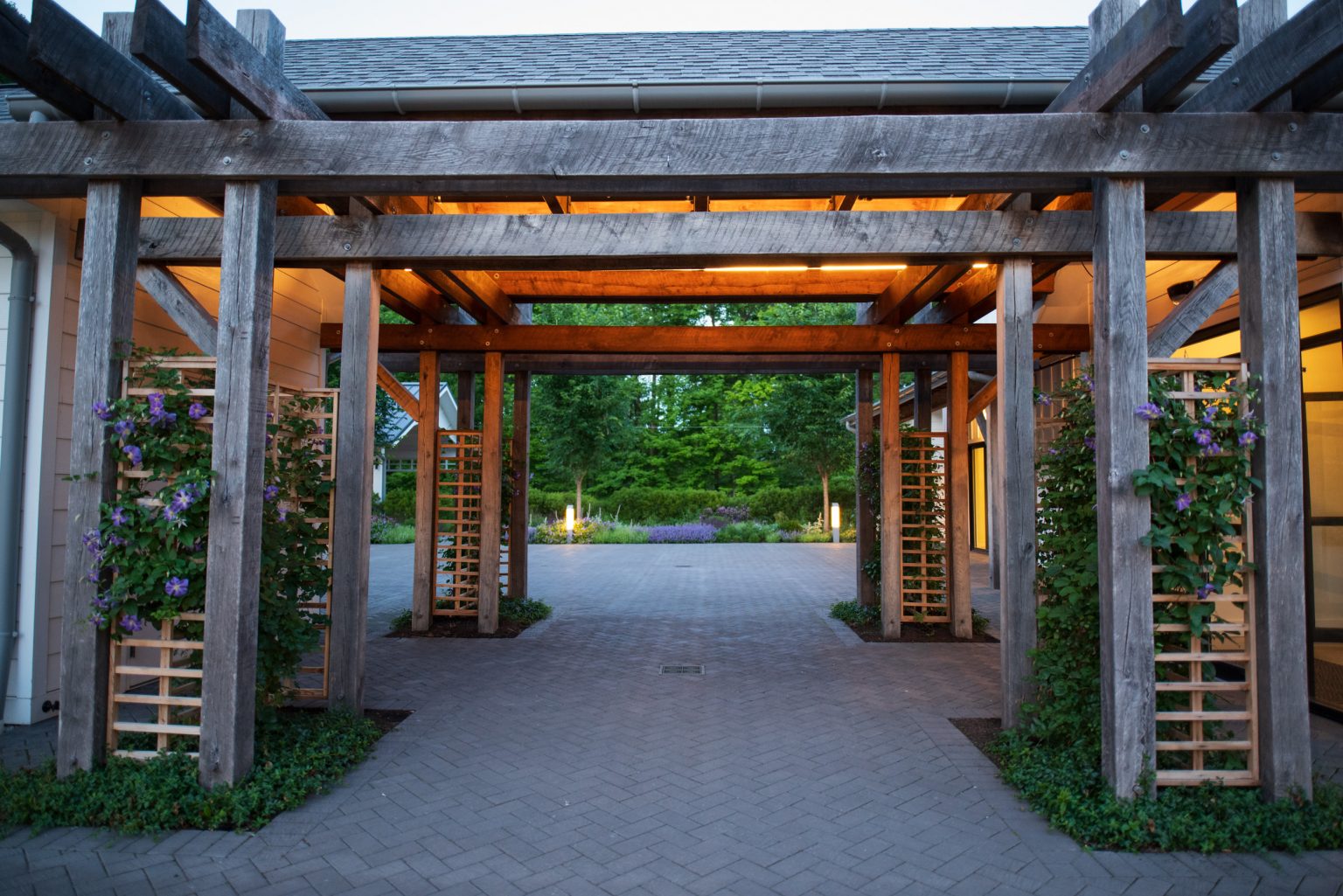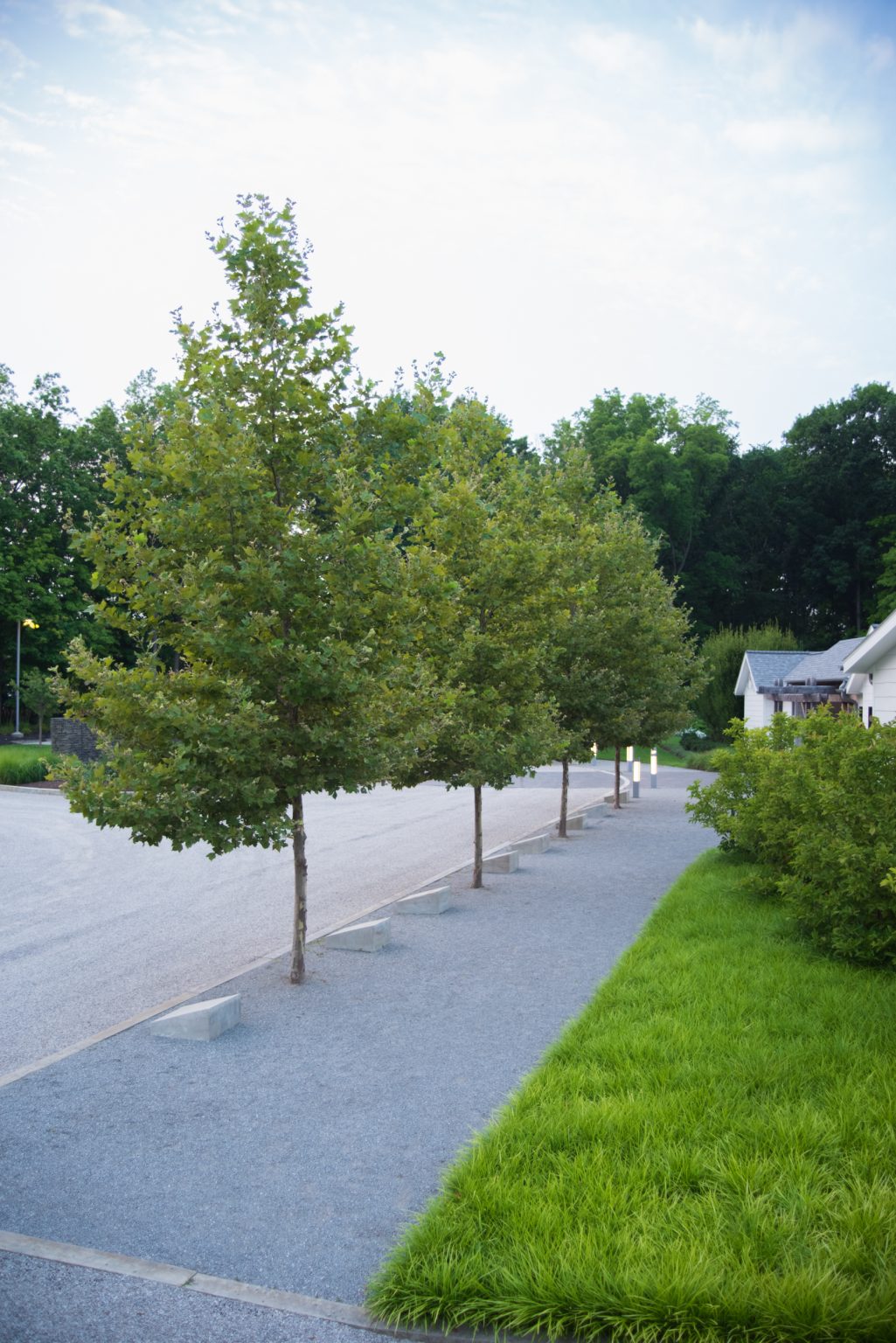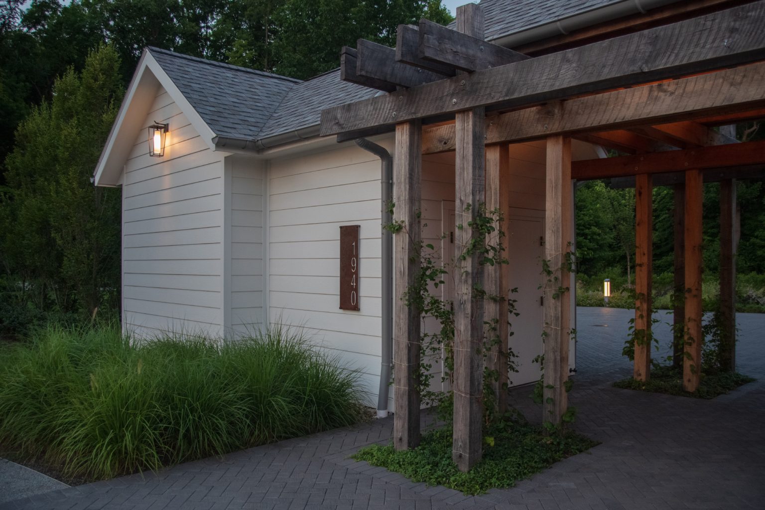 Highfields Event Center was created to share the beauty of this second- generation farmland with the community in a much-needed venue beautiful enough to match the surrounding grounds. Working closely with the DS Architects Design Team, KGK developed a comprehensive site plan connecting indoors and out. Guests are welcomed to the property by a circular sign bed featuring a gabion wall with illuminated Corten steel sign and lush plantings. Circulating around the Entry Auto Court, visitors pass by the native meadow bioswale before reaching the center’s entry terrace. Simple tree and foundation plantings were selected to allow Highfield’s architectural details to be the focus of attention. Bollard light fixtures, sandstone curbing, and the rough-sawn cedar pergola blend new and old to create a truly unique venue entrance.