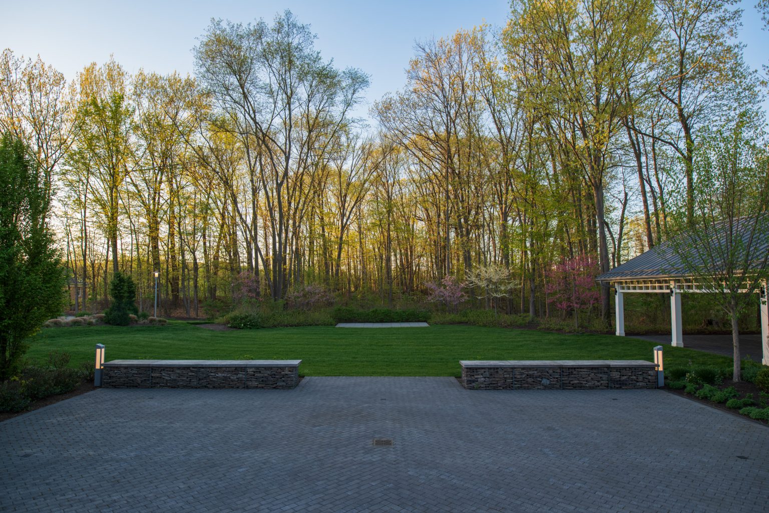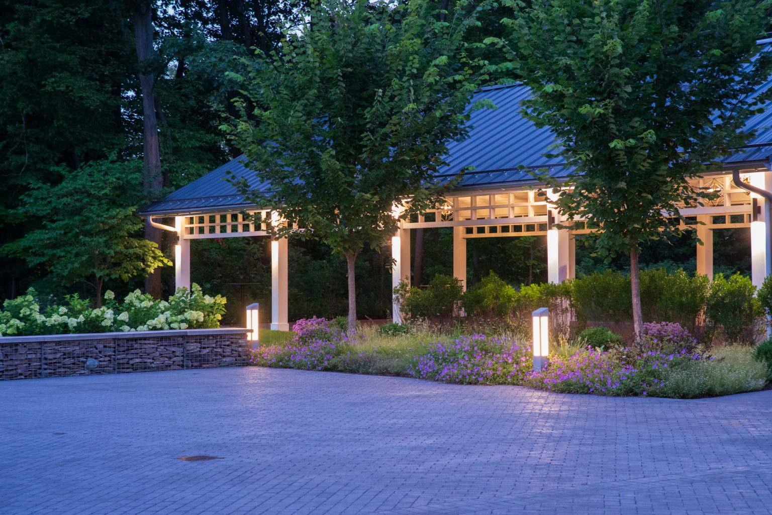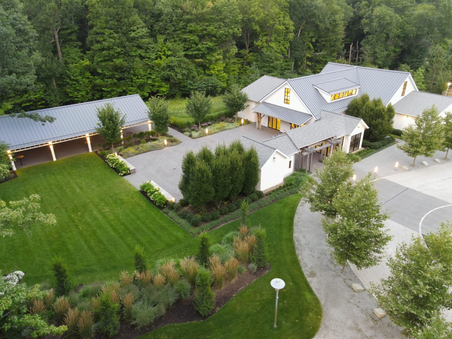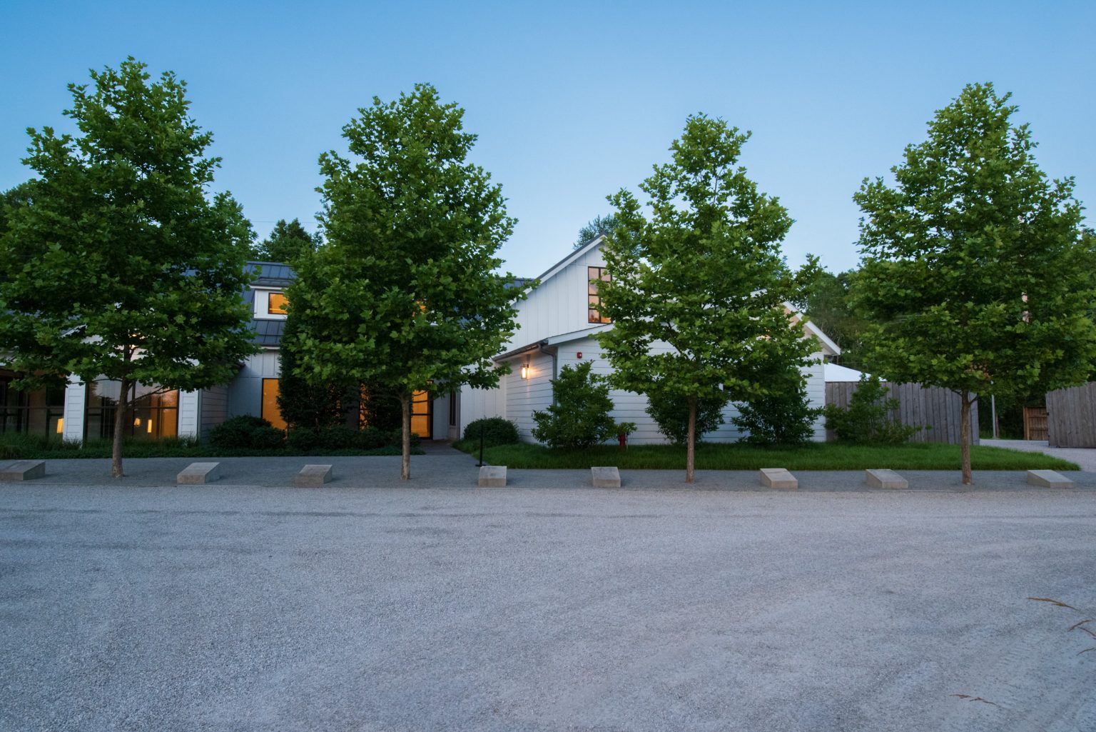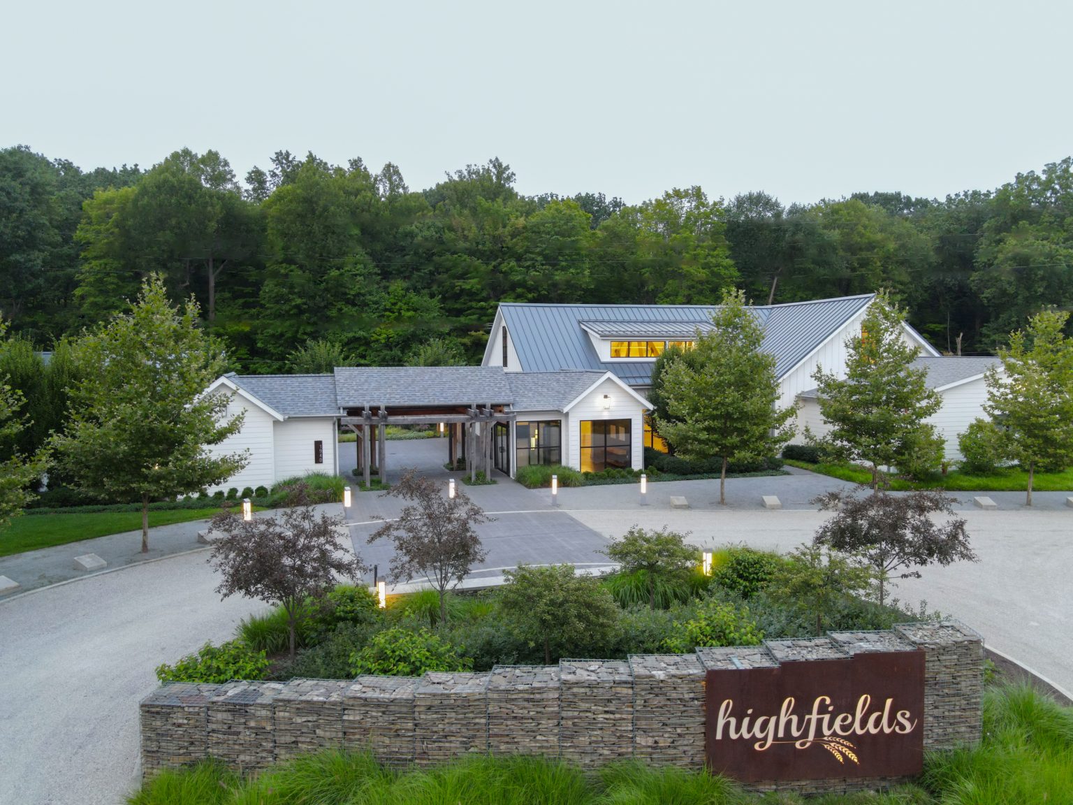 Highfields Event Center was created to share the beauty of this second- generation farmland with the community in a much-needed venue beautiful enough to match the surrounding grounds. Working closely with the DS Architects Design Team, KGK developed a comprehensive site plan connecting indoors and out. Guests are welcomed to the property by a circular sign bed featuring a gabion wall with illuminated Corten steel sign and lush plantings. Circulating around the Entry Auto Court, visitors pass by the native meadow bioswale before reaching the center’s entry terrace. Simple tree and foundation plantings were selected to allow Highfield’s architectural details to be the focus of attention. Bollard light fixtures, sandstone curbing, and the rough-sawn cedar pergola blend new and old to create a truly unique venue entrance.