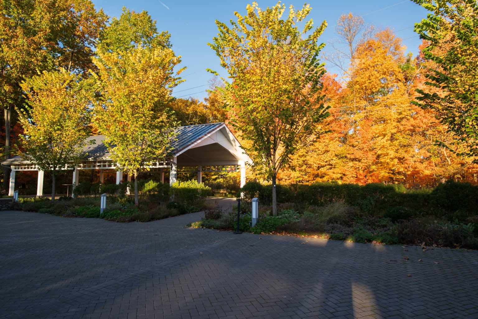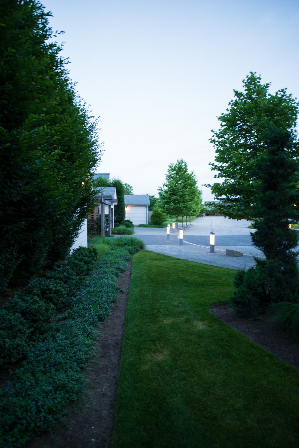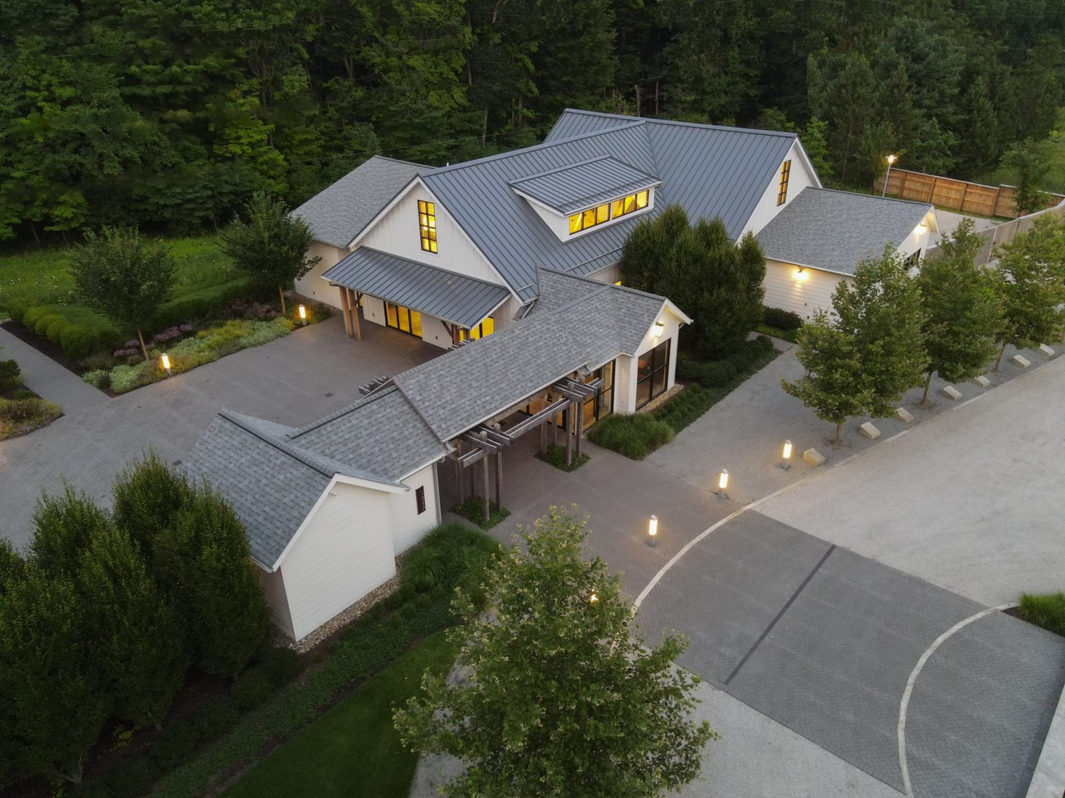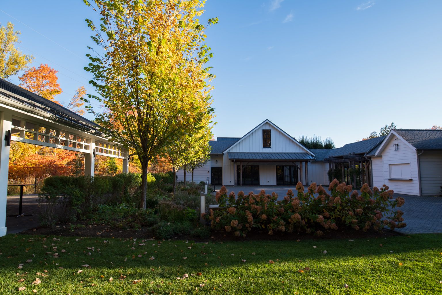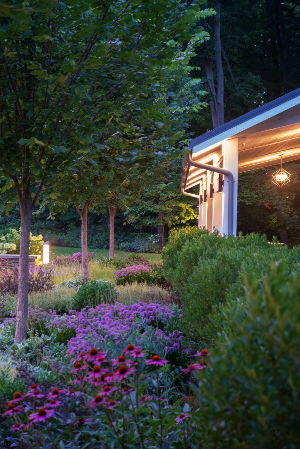 Highfields Event Center was created to share the beauty of this second- generation farmland with the community in a much-needed venue beautiful enough to match the surrounding grounds. Working closely with the DS Architects Design Team, KGK developed a comprehensive site plan connecting indoors and out. Guests are welcomed to the property by a circular sign bed featuring a gabion wall with illuminated Corten steel sign and lush plantings. Circulating around the Entry Auto Court, visitors pass by the native meadow bioswale before reaching the center’s entry terrace. Simple tree and foundation plantings were selected to allow Highfield’s architectural details to be the focus of attention. Bollard light fixtures, sandstone curbing, and the rough-sawn cedar pergola blend new and old to create a truly unique venue entrance.