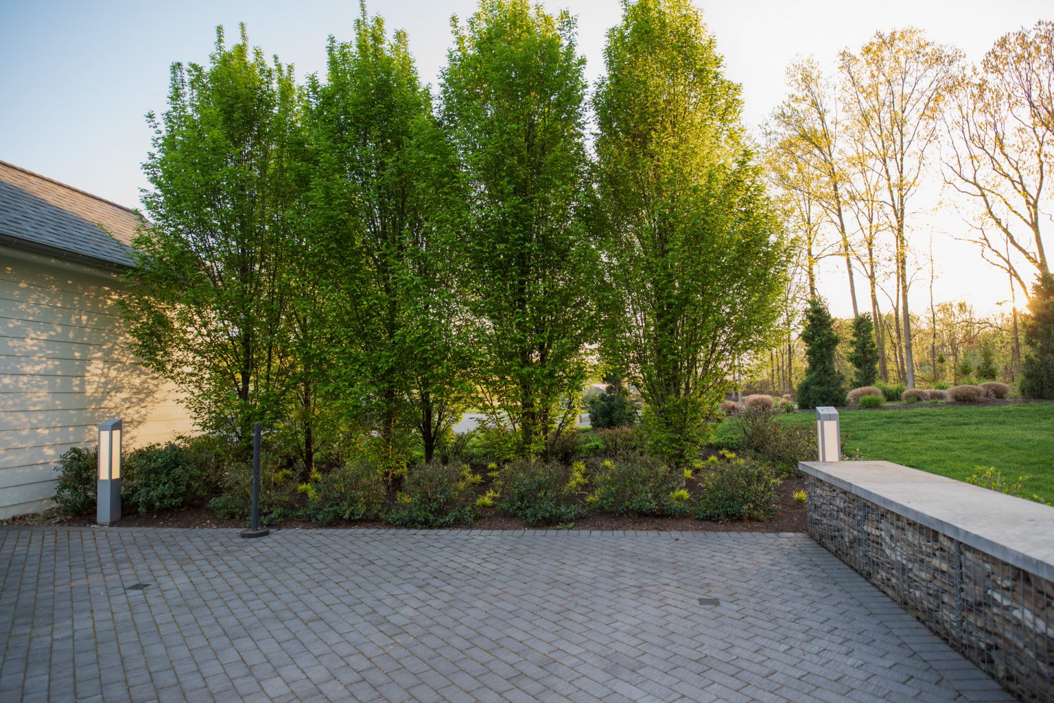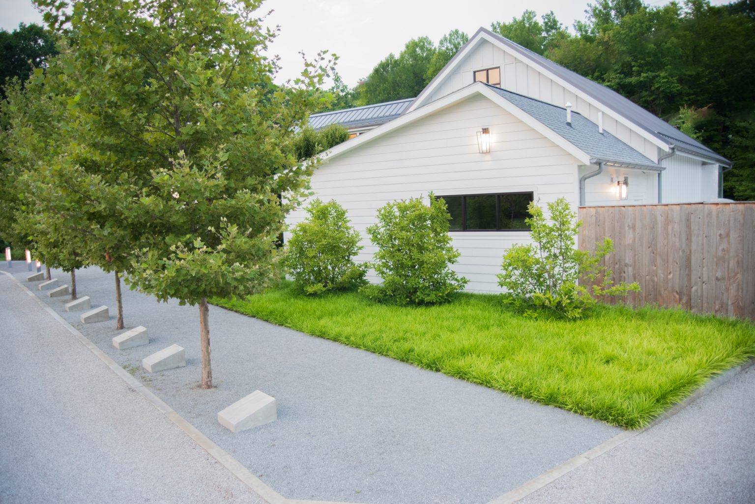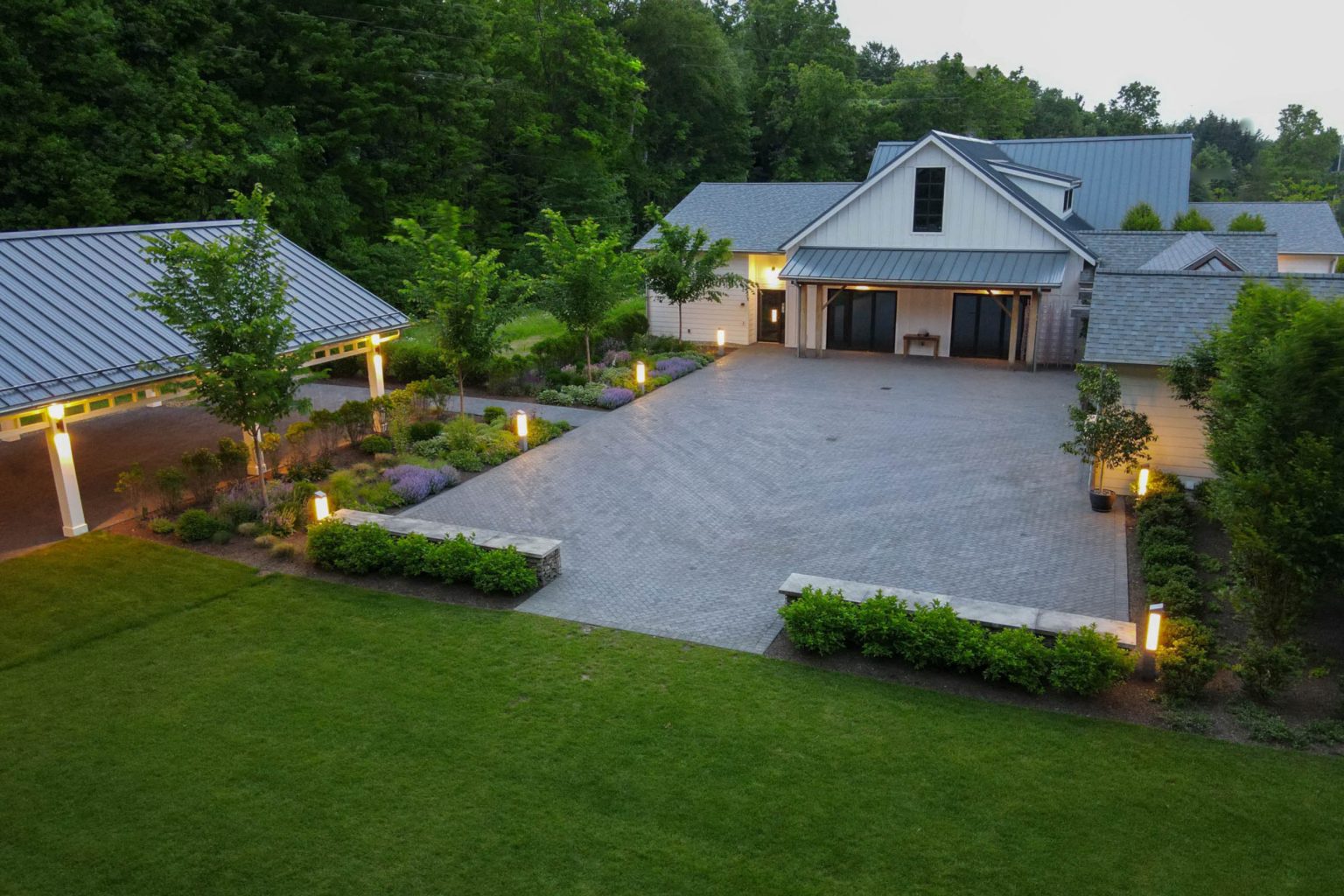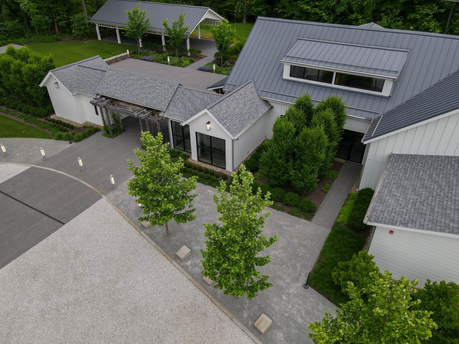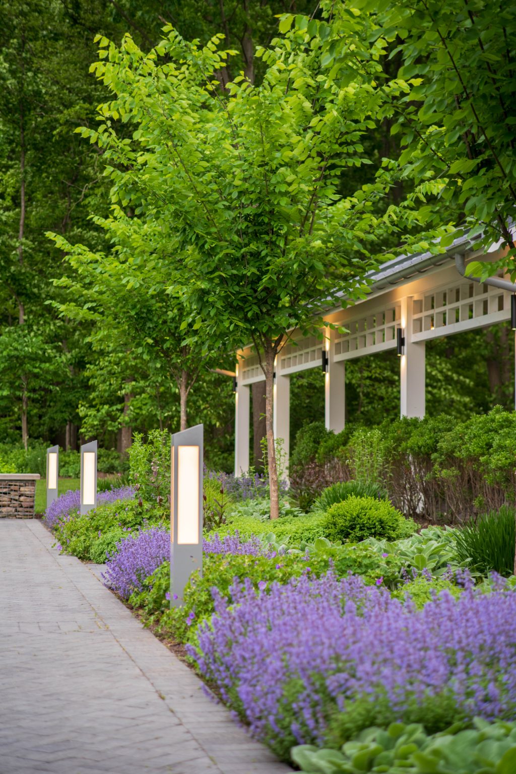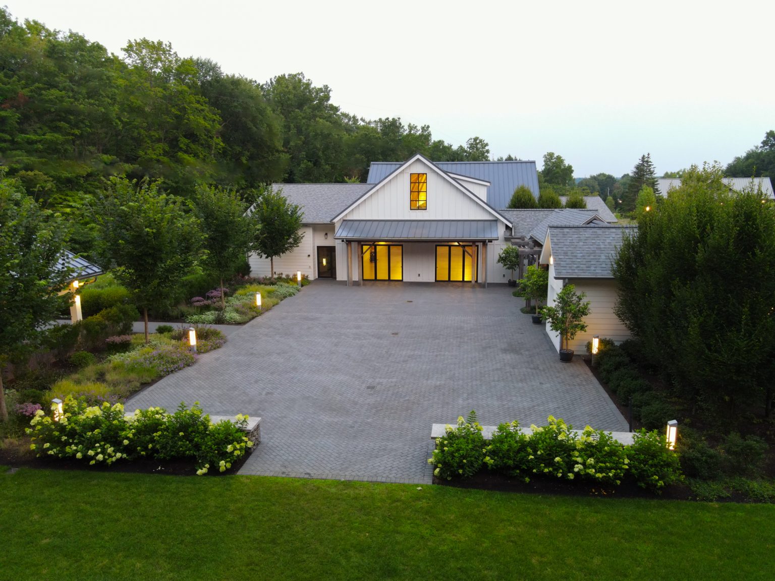 Highfields Event Center was created to share the beauty of this second- generation farmland with the community in a much-needed venue beautiful enough to match the surrounding grounds. Working closely with the DS Architects Design Team, KGK developed a comprehensive site plan connecting indoors and out. Guests are welcomed to the property by a circular sign bed featuring a gabion wall with illuminated Corten steel sign and lush plantings. Circulating around the Entry Auto Court, visitors pass by the native meadow bioswale before reaching the center’s entry terrace. Simple tree and foundation plantings were selected to allow Highfield’s architectural details to be the focus of attention. Bollard light fixtures, sandstone curbing, and the rough-sawn cedar pergola blend new and old to create a truly unique venue entrance.