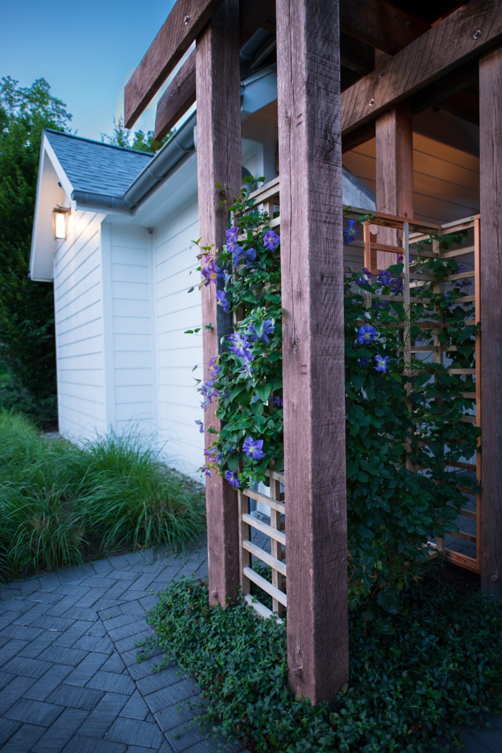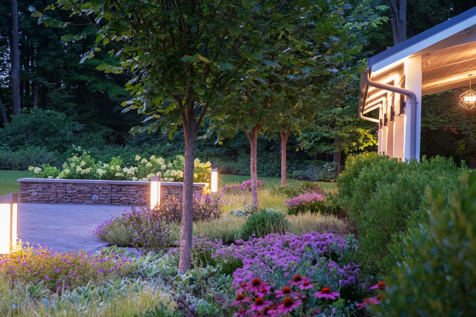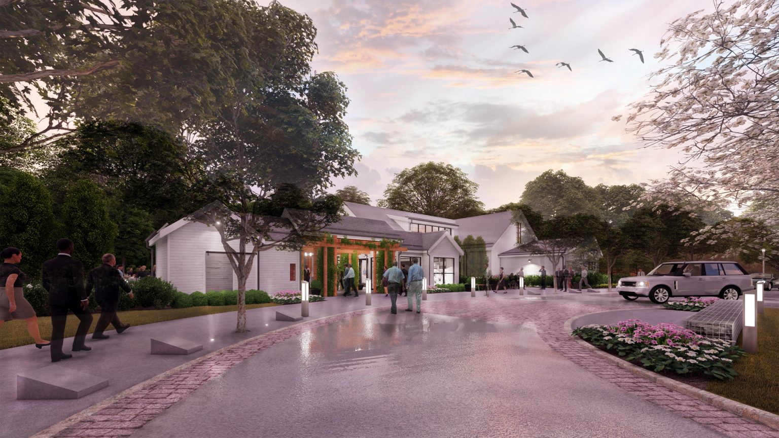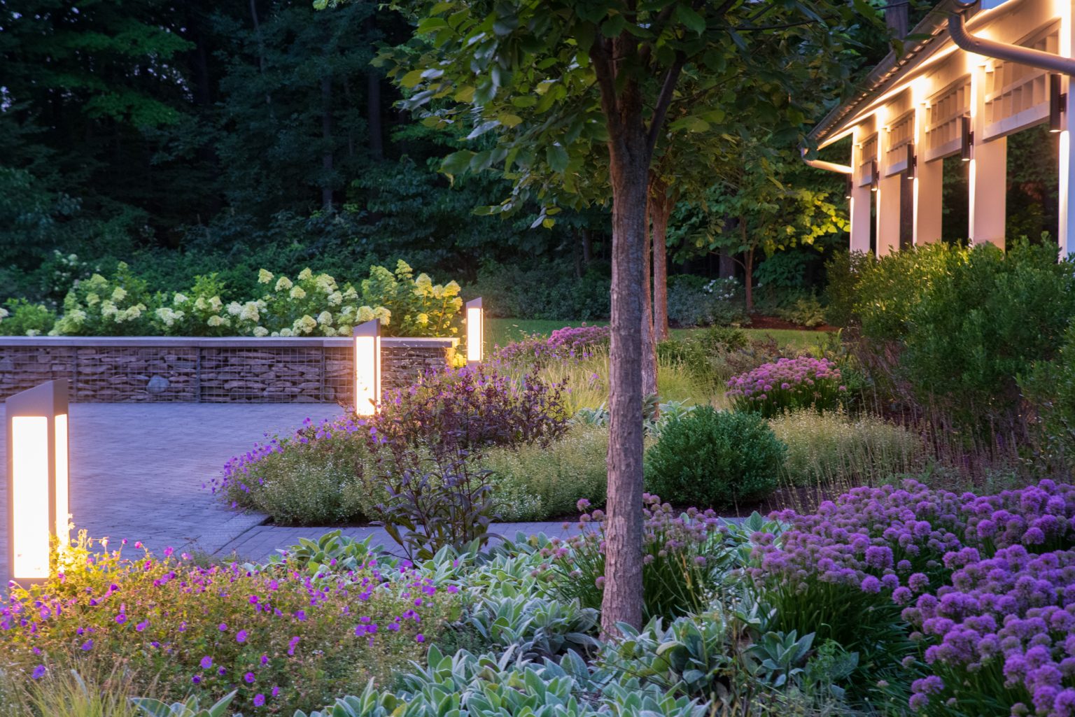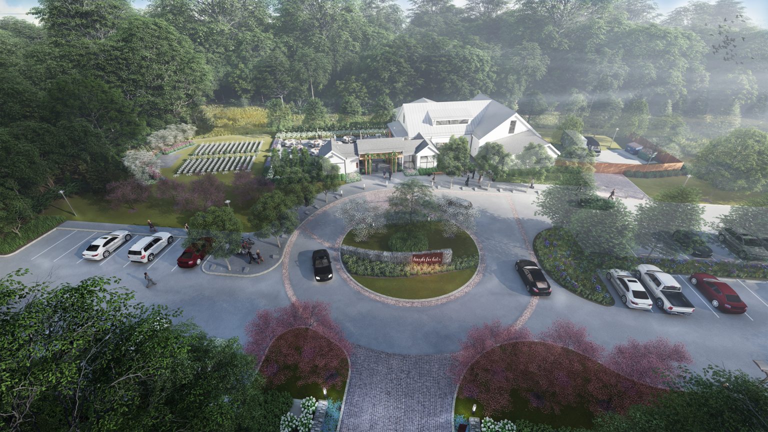 Highfields Event Center was created to share the beauty of this second- generation farmland with the community in a much-needed venue beautiful enough to match the surrounding grounds. Working closely with the DS Architects Design Team, KGK developed a comprehensive site plan connecting indoors and out. Guests are welcomed to the property by a circular sign bed featuring a gabion wall with illuminated Corten steel sign and lush plantings. Circulating around the Entry Auto Court, visitors pass by the native meadow bioswale before reaching the center’s entry terrace. Simple tree and foundation plantings were selected to allow Highfield’s architectural details to be the focus of attention. Bollard light fixtures, sandstone curbing, and the rough-sawn cedar pergola blend new and old to create a truly unique venue entrance.